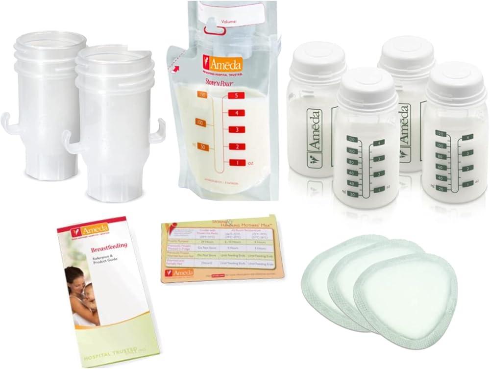مجموعة المبتدئين المثالية للأم التي تضخ الثدي! تتضمن 20 كيسًا لجمع الحليب ستور اند بور مع محولين شفتين، و10 وسادات ثدي فاخرة للاستعمال مرة واحدة من نو شو، و4 زجاجات تخزين حليب الأم، ودليل مرجعي للرضاعة الطبيعية، وبطاقة إرشادات حديثة لتخزين الحليب.