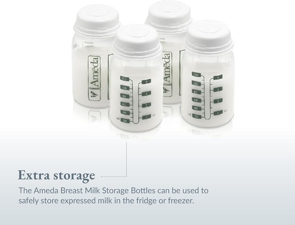 مساحة تخزين إضافية: يمكن استخدام زجاجات تخزين حليب الثدي اميدا لتخزين الحليب المعبر بأمان في الثلاجة أو الفريزر. تحمل علامات واضحة لقياس الحليب الخاص بك، فهي تحتوي على مساحة لوضع ملصقات واضحة وخيوط عالمية متوافقة مع جميع مجموعات المضخات القياسية.