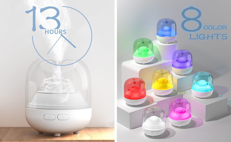 8 amazing Colors Essential Oil Diffuser: This essential oil diffusers has 8 colors LED lights.Press the "Light" button to adjust any color you like,8 different colors to cycle through or select one fixed color.It can also be a night light diffuser for sleeping. Light can also be turn off completely for total darkness.