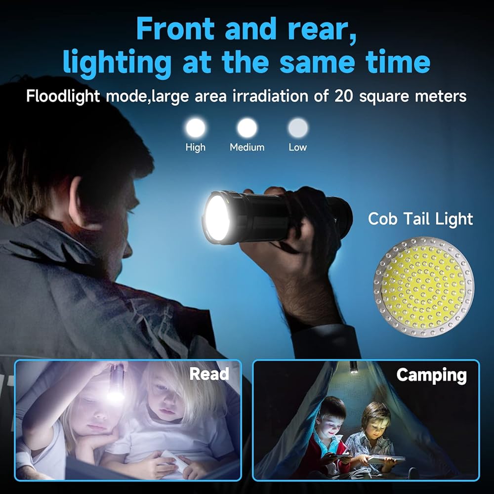 • 【مصباح يدوي فائق السطوع 120000 لومن】يمكن إضاءة هذا المصباح اليدوي الفريد عالي السطوع القابل لإعادة الشحن على كلا الطرفين الأمامي والخلفي. على عكس المصابيح اليدوية الأخرى ذات اللومن العالي ذات القيم المبالغ فيها، فإن مصباح LED هذا له حد أقصى حقيقي يبلغ 120000 لومن، ويمكن للشعاع العريض للغاية أن يضيء بسهولة الغرفة بأكملها والفناء الخلفي وحتى ملعب كرة القدم، وأبعد مسافة إضاءة هي 3200 قدم، ويمكن استخدامه على نطاق واسع في حالات الطوارئ والتخييم والمشي لمسافات طويلة ليلاً وصيد الأسماك والصيد.