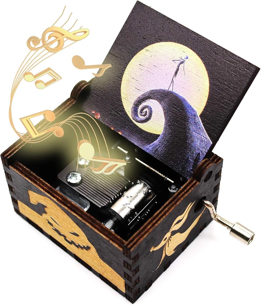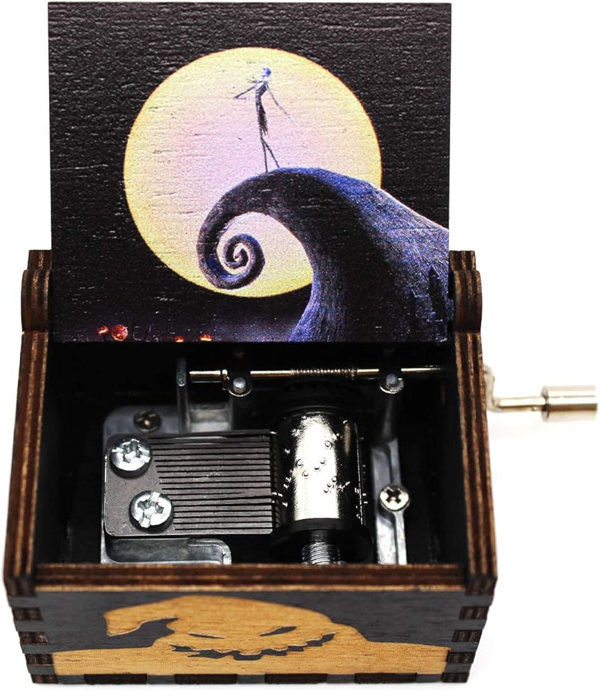 صندوق موسيقى خشبي جميل مع رسالة ذات مغزى محفورة داخل الصندوق. اللحن الجميل لـ "The Nightmare Before Christmas" سوف "يذهل" حبيبك أو طفلك/صديقك أثناء قيامه بتدوير المقبض.