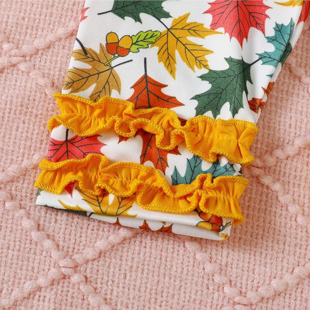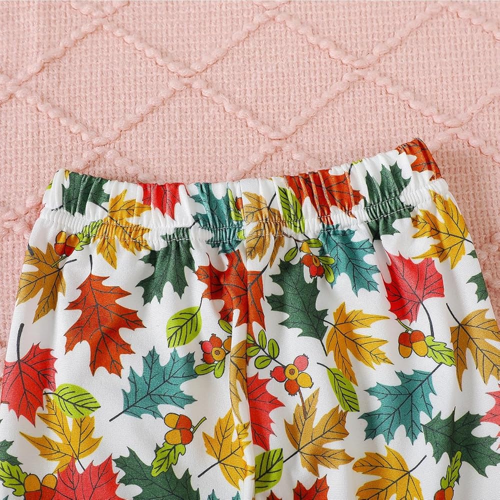 ملابس خريفية لطيفة للفتيات الصغيرات. تصميم بنطال أوراق القيقب متعدد الألوان، ارتداء ملابس خريفية للفتيات الصغيرات يشبه جنية الخريف التي تهبط إلى الأرض.