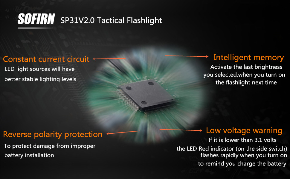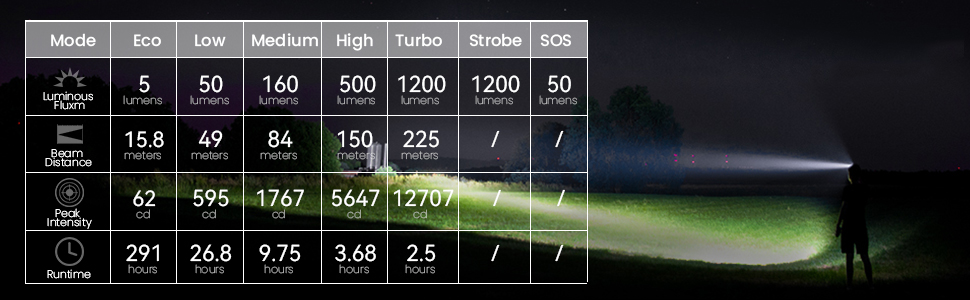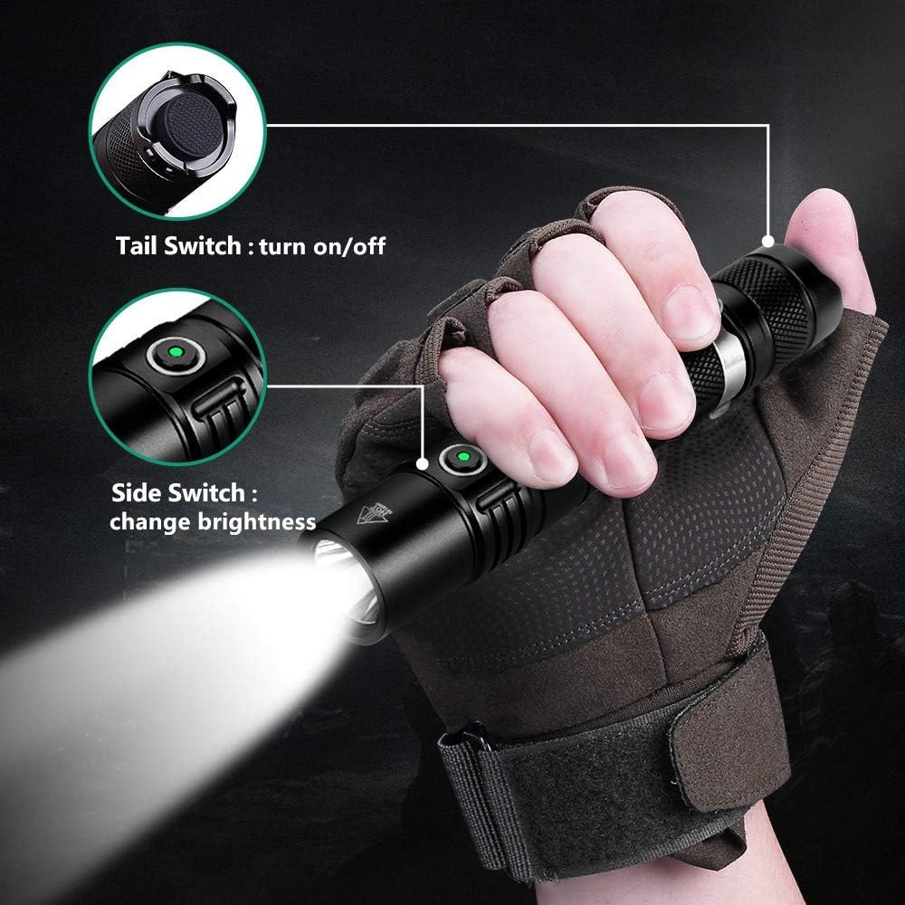 مصباح LED عالي الجودة: يستخدم هذا المصباح التكتيكي نسخة مطورة من LED، وهو أكثر سطوعًا ومتانة. يوفر شعاعًا ساطعًا يصل إلى 1200 لومن ويلقي 700 قدم ويحتوي على خمسة أوضاع إضاءة أساسية (ايكو منخفضة ومنخفضة ومتوسطة وعالية توربو) ووضعين للوميض. تلبي تمامًا جميع احتياجات الإضاءة الخاصة بك.