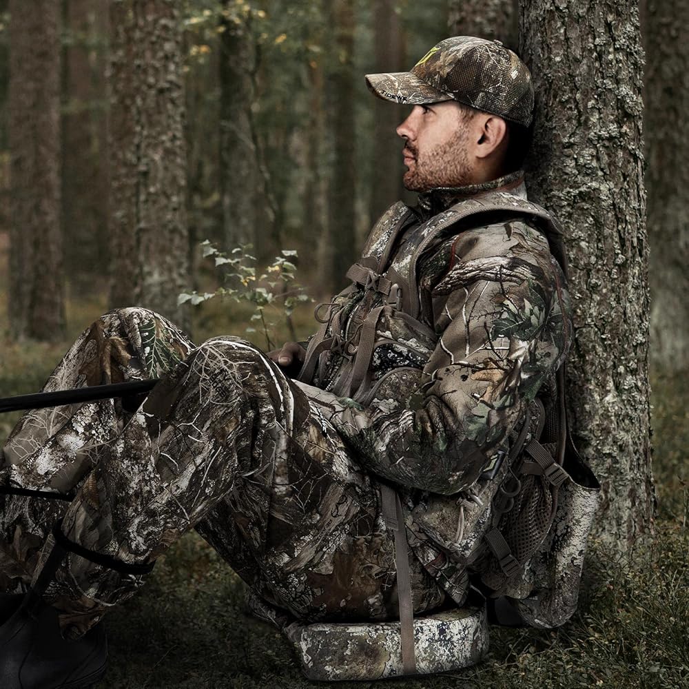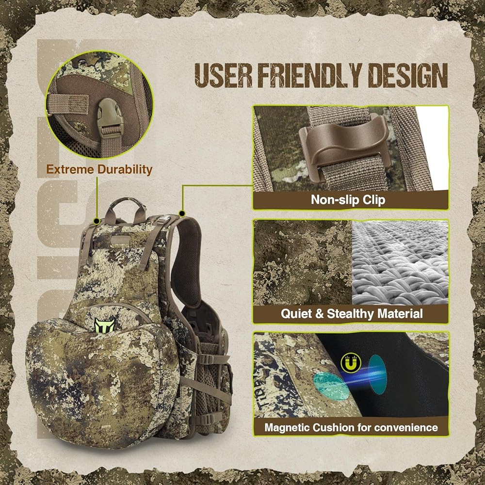 【Comfortable & Functional】The turkey vest is equipped with a removable and adjustable 3-inch cushioned seat with magnetic interface, which provides you with more comfort when sitting. The padded back with breathable mesh and ergonomic design offers the most comfortable hunting experience. It is made of brushed cloth and noise reduction fabric, which helps you remain silent while hunting while ensuring its durability.