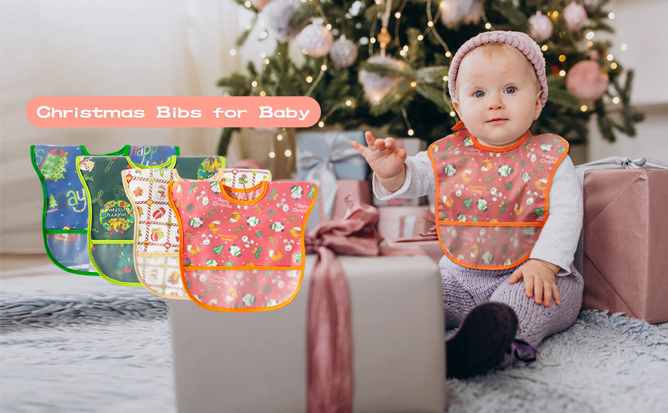 • What you will get: The adjustable Christmas baby bibs come in 4 different styles such as Santa Claus on green background, moose sleigh on dark blue background, round ball on white background, and snowman on red background, perfect for Christmas. The unisex pattern design and polyester waterproof material prevent your baby's clothes from getting stained with sauce or soup while eating and keep you from constantly worrying about choosing a boy or girl style bib. Save parents' time, and energy.