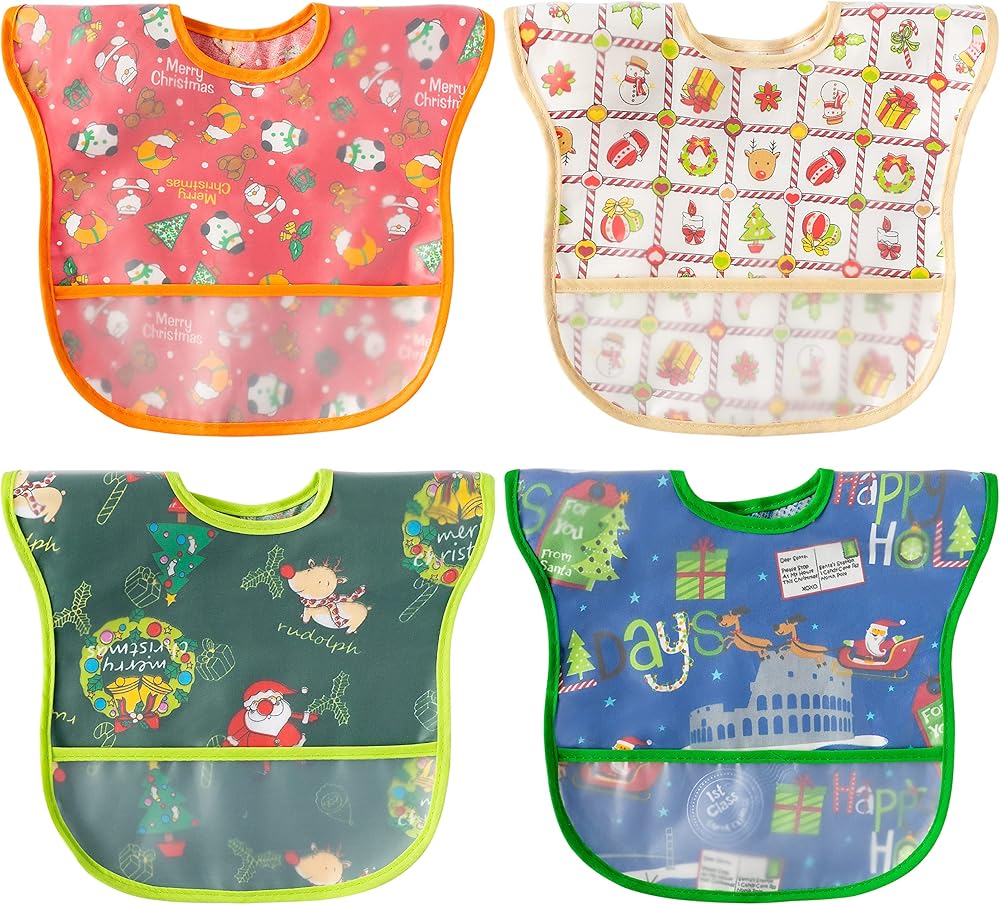 2ooya 4 قطع مريلة عيد الميلاد للأطفال مريلة مضادة للماء للأطفال الصغار مريلة تغذية مع جيب لالتقاط الفتات للرضع قابل للتعديل مريلة طعام للتسنين هدية تذكارية لعيد الميلاد (6-12 شهرًا)