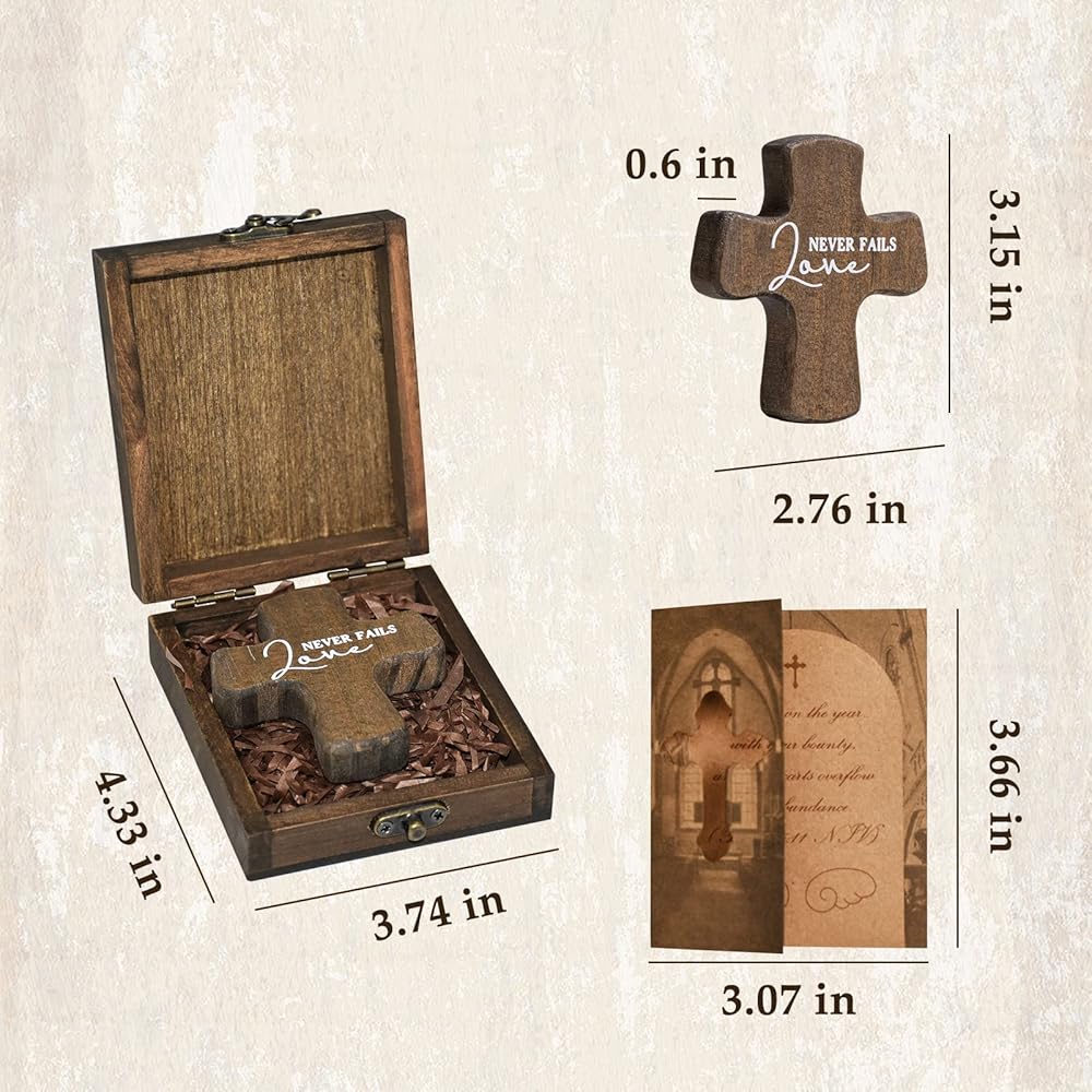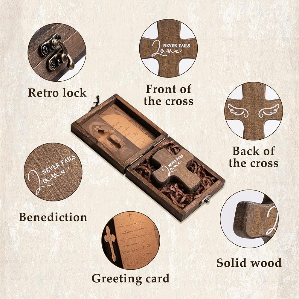 ✙ بركات من الكتاب المقدس: كل صليب خشبي مع صندوق هدايا خشبي كلاسيكي كلاسيكي، وكل صليب مطبوع عليه أفضل الأمنيات، وأجنحة الملائكة، وكل بطاقة هدية تكتب البركات "أنت تتوج العام بمكافأتك، وتفيض عربات التسوق الخاصة بك بكثرة من مزمور 65 : 11 .