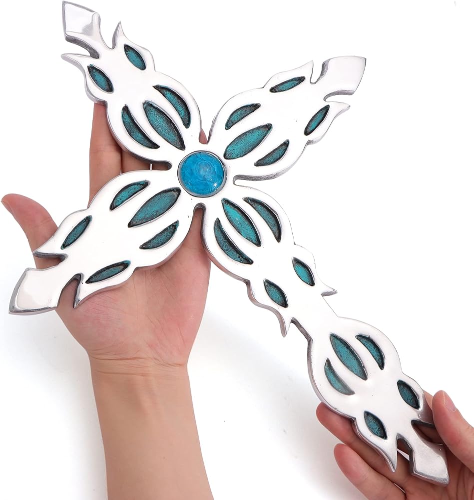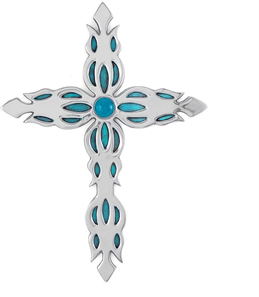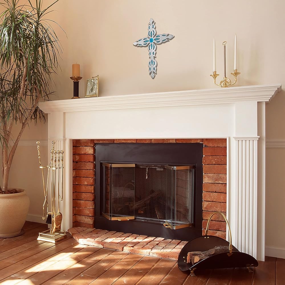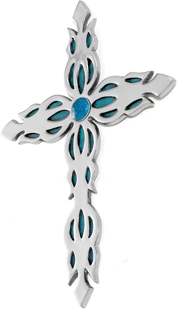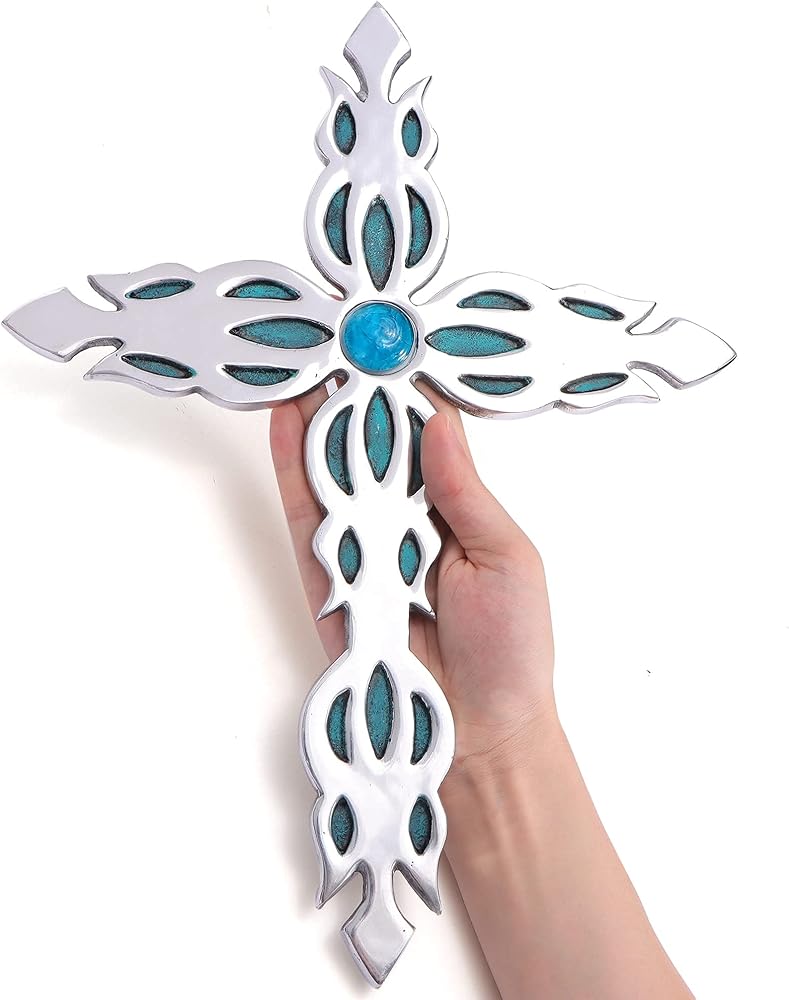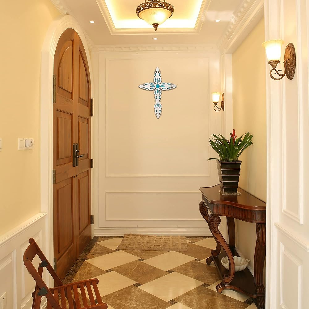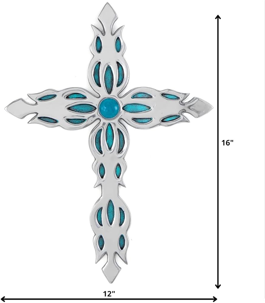 تفاصيل دقيقة: هذا الصليب الزخرفي العائلي مصنوع يدويًا من البيوتر، بلمسة نهائية باللون الفضي والأزرق مع حشوة زجاجية. يبلغ مقاس ديكور الحائط المنزلي المتقاطع 12 انش × 16 انش.