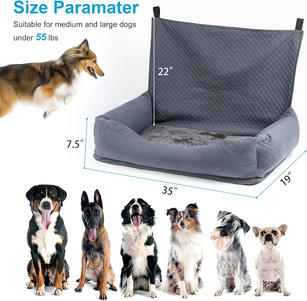 🐕Perfect Dog Car Seats for Larger/Medium Breeds: Dog car seats for large dogs are designed to provide your furry friend with a cozy ride, our dog car seat is the ultimate solution for larger breeds weighing up to 55lbs. With the perfect size of 35"*19"*7.5", suitable for all kinds of vehicles, fits SUV, pick-up, trucks, off-roaders, your pet can sit, lay, and sleep comfortably safely throughout your ride.