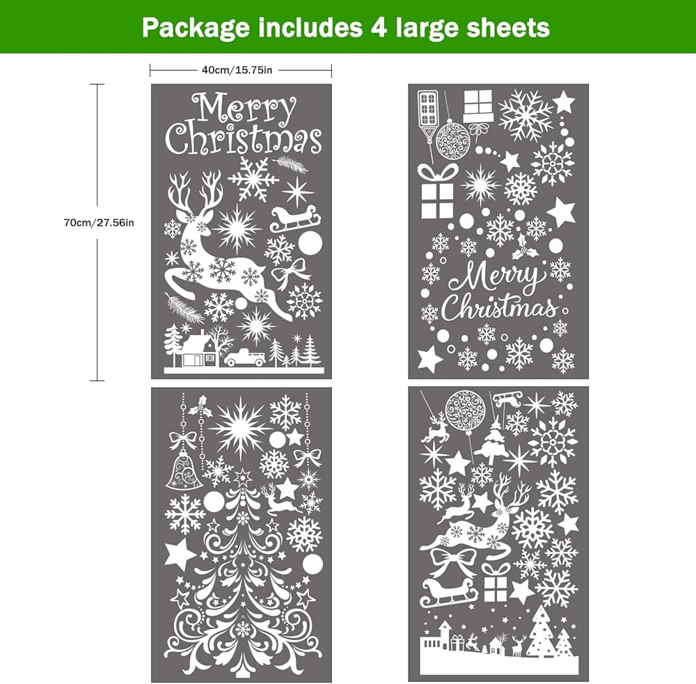 ❉ مجموعة قيمة: ستحصل على 4 أوراق لاصقة لنافذة عيد الميلاد، إجمالي 120 قطعة من الملصقات، تتميز برقائق الثلج وعناصر عيد الميلاد الكلاسيكية الأخرى بأحجام وأشكال مختلفة، تلبي جميع احتياجاتك لديكورات نوافذ عيد الميلاد إلى حد كبير