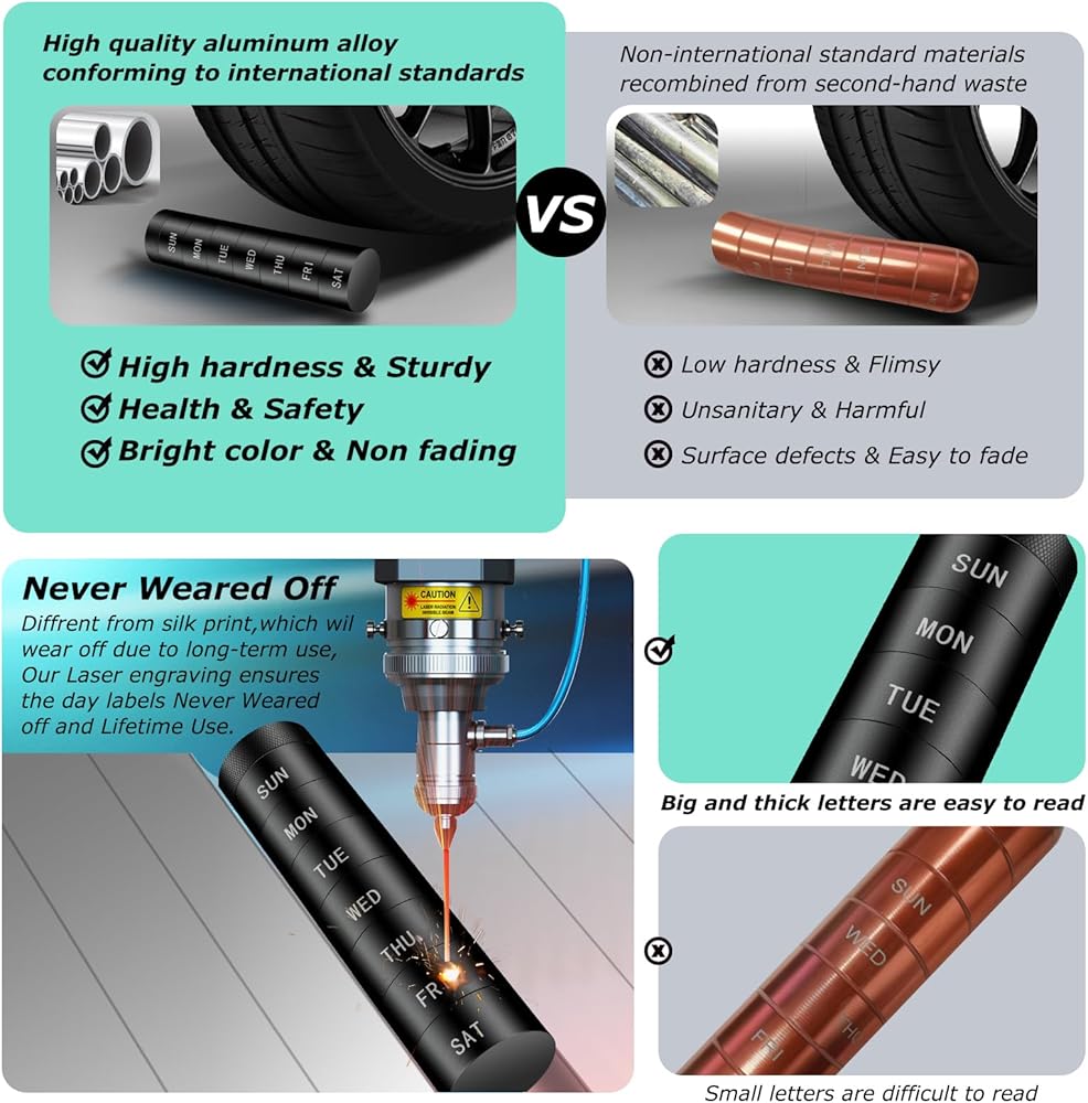 【 تقنية النقش بالليزر】بدلاً من الطباعة العادية، يستخدم منظم الفيتامينات الخاص بنا تقنية النقش بالليزر المحدثة، وهي متينة وصلبة بما يكفي لنعدك بعدم التآكل أبدًا. الأيام محفورة في المعدن بإحكام وتجعل الحروف عليها مرئية بوضوح. يمكنك استخدام حاوية حبوب الدواء الخاصة بنا بشكل دائم.