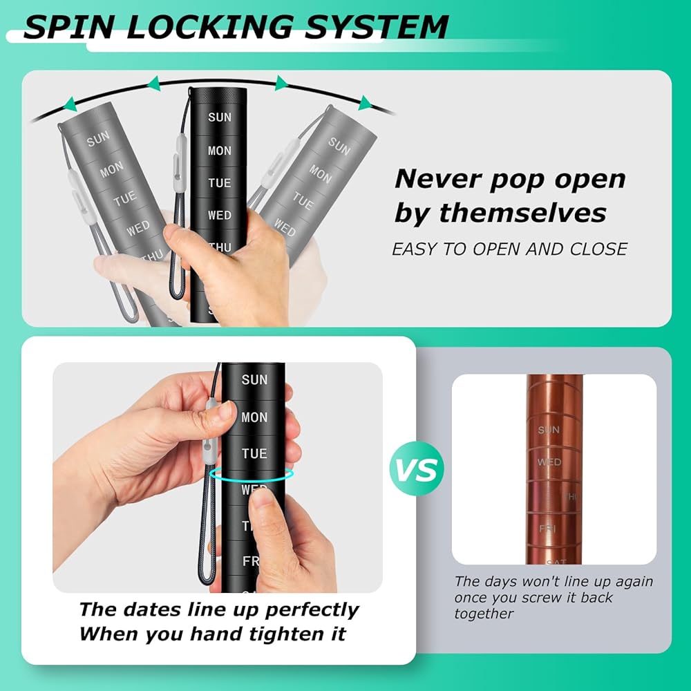 【الأفضل للسفر أثناء التنقل】تصميم قفل دوار للمساعدة في قفل أدويتك بأمان وسهولة الفتح وإعادة الملء. بعد قفله، ستبقى مغلقة، ولن تنبثق أو تنسكب عن طريق الخطأ في حقيبة اليد أو حقيبة السفر أو حقيبة الظهر أو المحفظة عند السفر. منظم المكملات الغذائية القابل للفصل القابل للتكديس يسمح لك بأخذ الأيام التي تحتاجها فقط. يوفر مساحة أكبر بكثير من السفر يجعلك تستمتع برحلتك بسهولة.