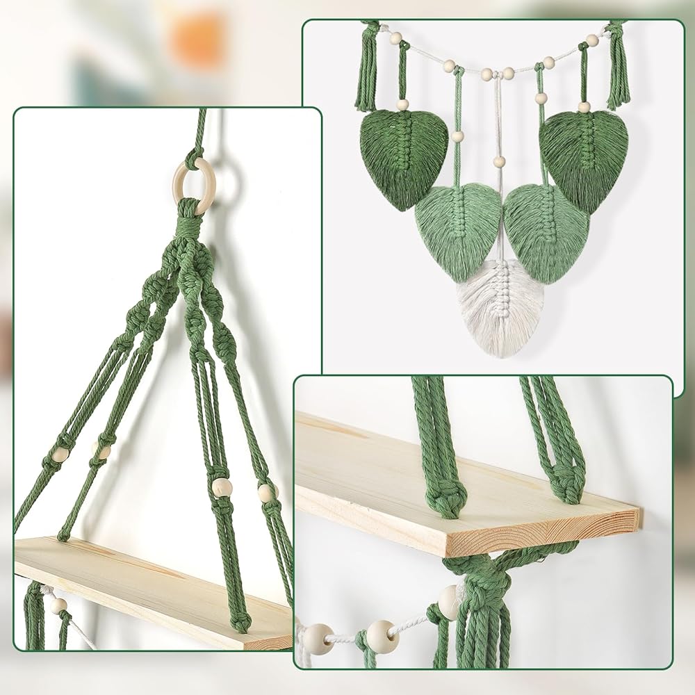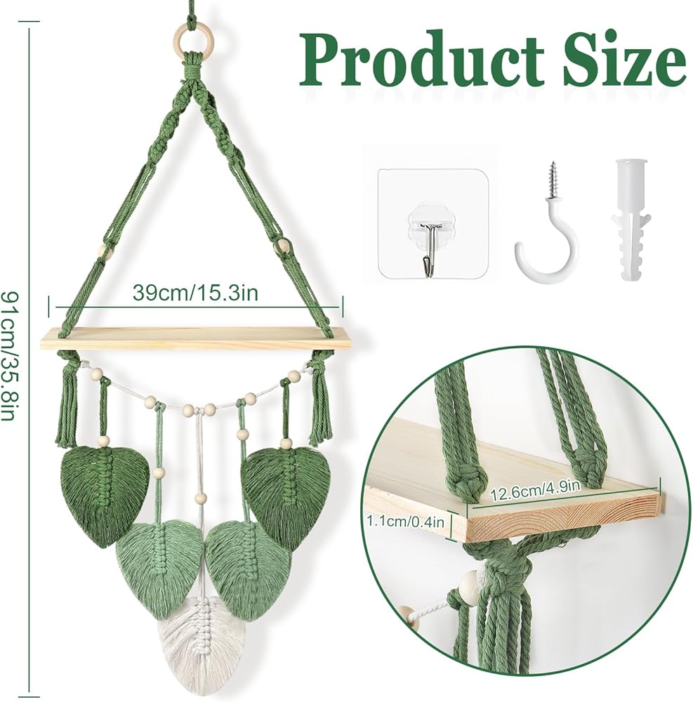 Package Includes: 2 macrame floating shelves with 2 hooks. There is a hanging ring at the top of each wall shelf, which is easy to hang on the wall.