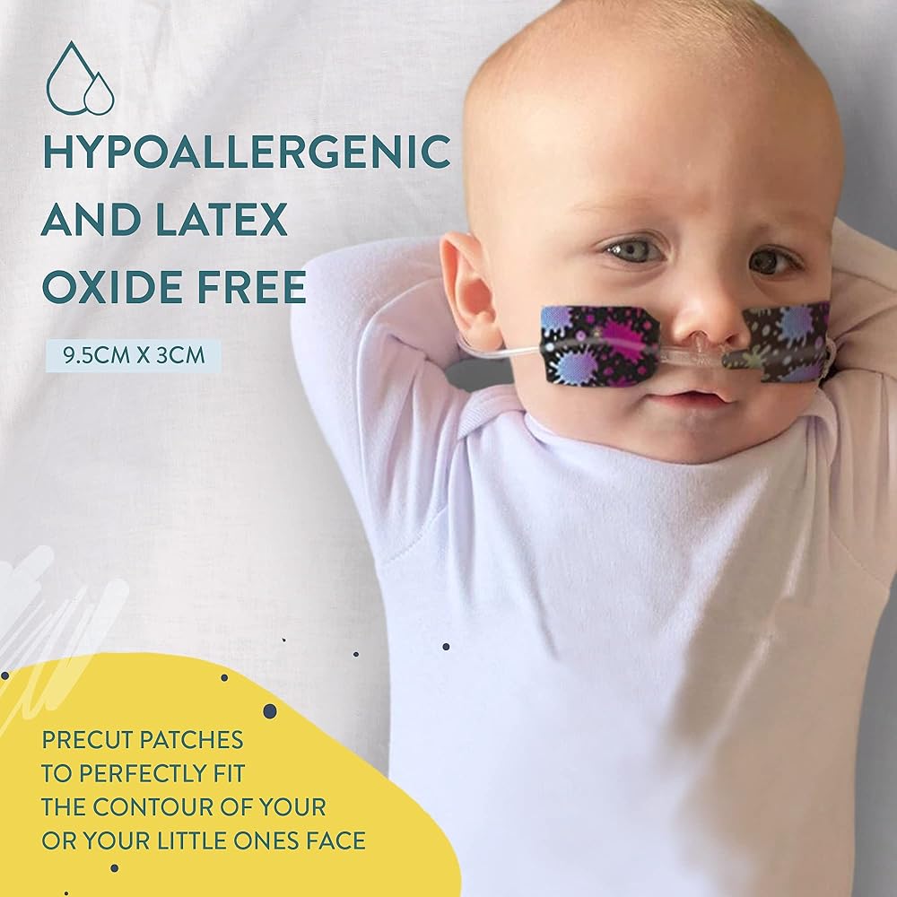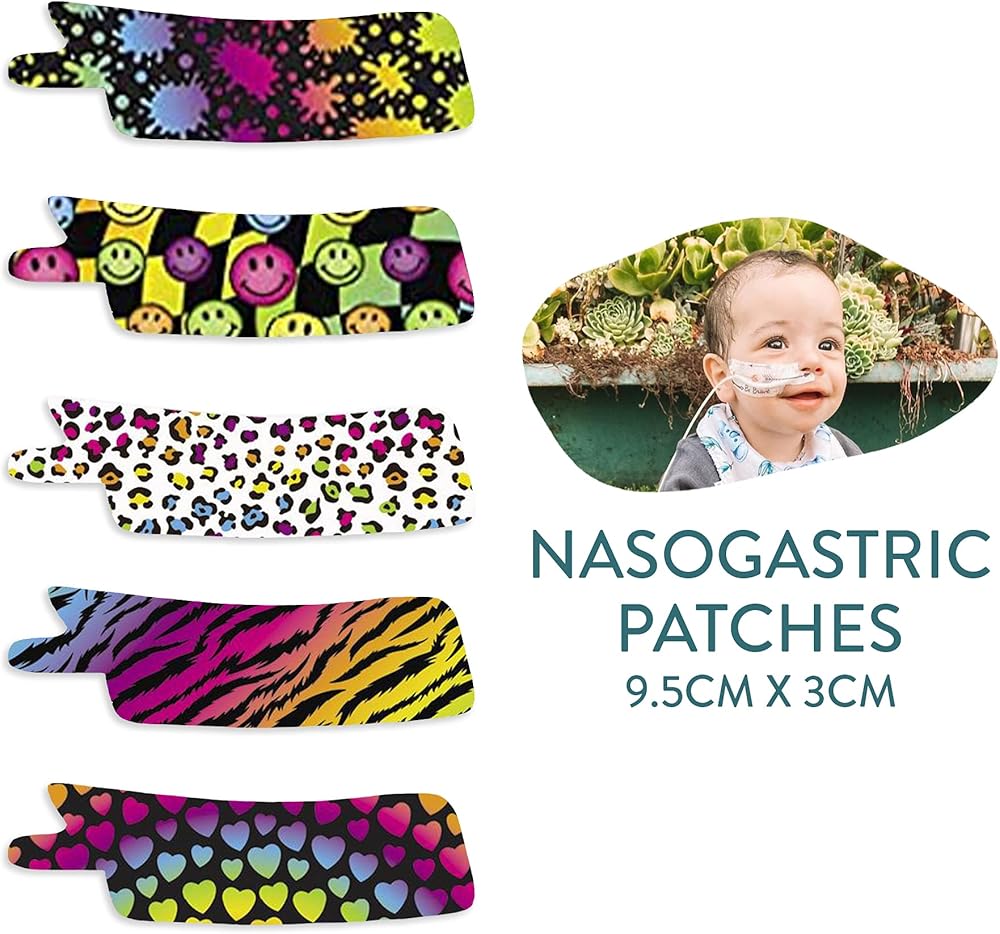 Adhesive tape to secure and add some color for a Nasogastric or oxygen tube. Manufactured from a hypoallergenic quality 3M medical grade tape, that is suitable for sensitive skin. Precut patches to perfectly fit the contour of yours or your little ones face. Available in left & right or a mixed pack. Package includes: 10 x Precut Patches 9cm x 2cm we can custom size if needed. Choose from our designs or make your own. Hypoallergenic and latex oxide free Manufactured on 3m medical grade tape. If you have any special requests please feel free to contact us. Some images may vary slightly. Patent Protected Design 201914705