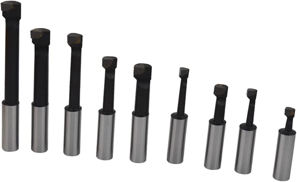 Boring Bar Shank Diameter : 1/2"Minimum Boring Range: 5/16" - 9/16"Overall Length:2-1/4" to 4-1/2"Boring Depth Range: 3/4" to 3"Package Includes : 9 pcs Boring Bar Set3pcs. 5/16" minimum bore (1 ea. 3/4" bore depth x 2-1/4" overall, 1 ea. 1-1/8" x 2-5/8", & 1 ea. 1-1/2" x 3")3pcs. 7/16" minimum bore (1 ea. 1-1/8" bore depth x 2-5/8" overall, 1 ea. 1-11/16" x 3-3/16", & 1 ea. 2-1/4" x 3-3/4")3pcs. 9/16" minimum bore (1 ea. 1-1/2" bore depth x 3" overall, 1 ea. 2-1/4" x 3-3/4", & 1 ea. 3" x 4-1/2")