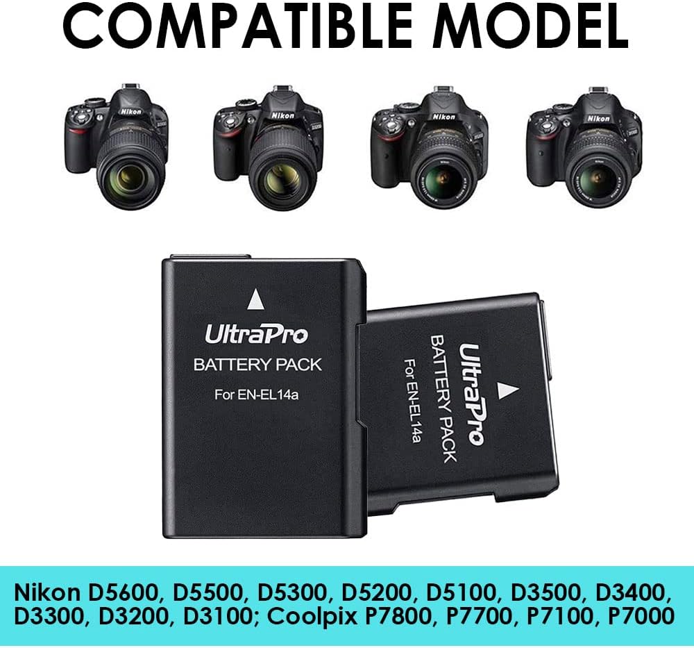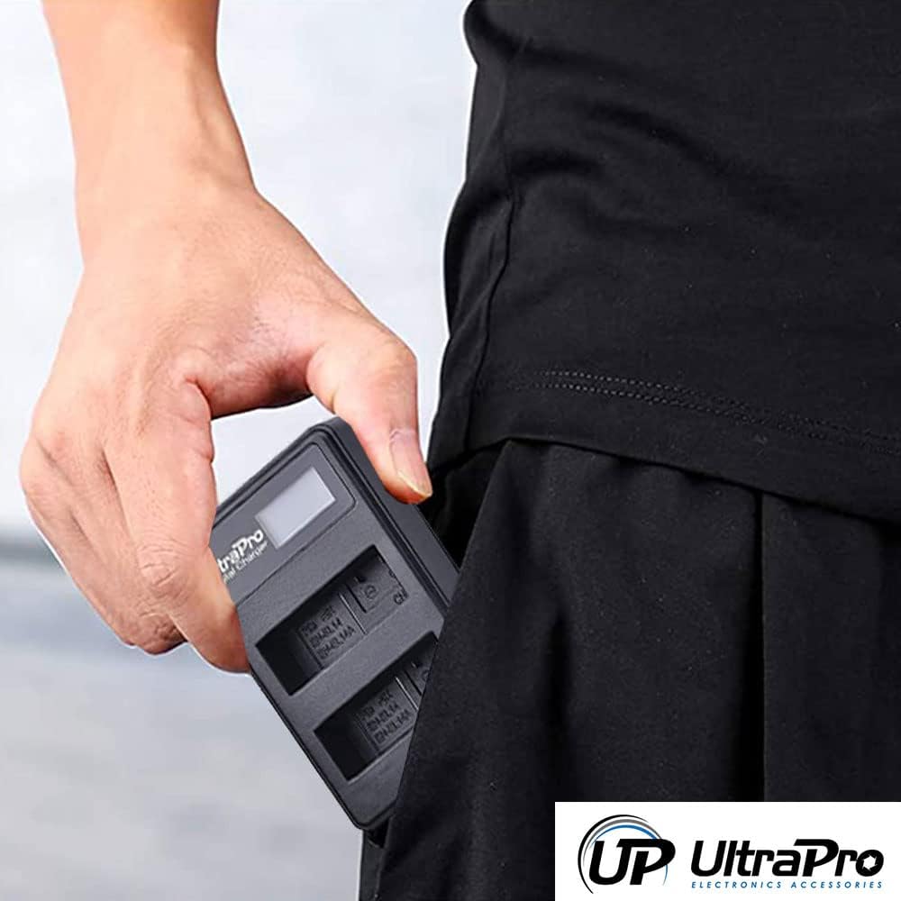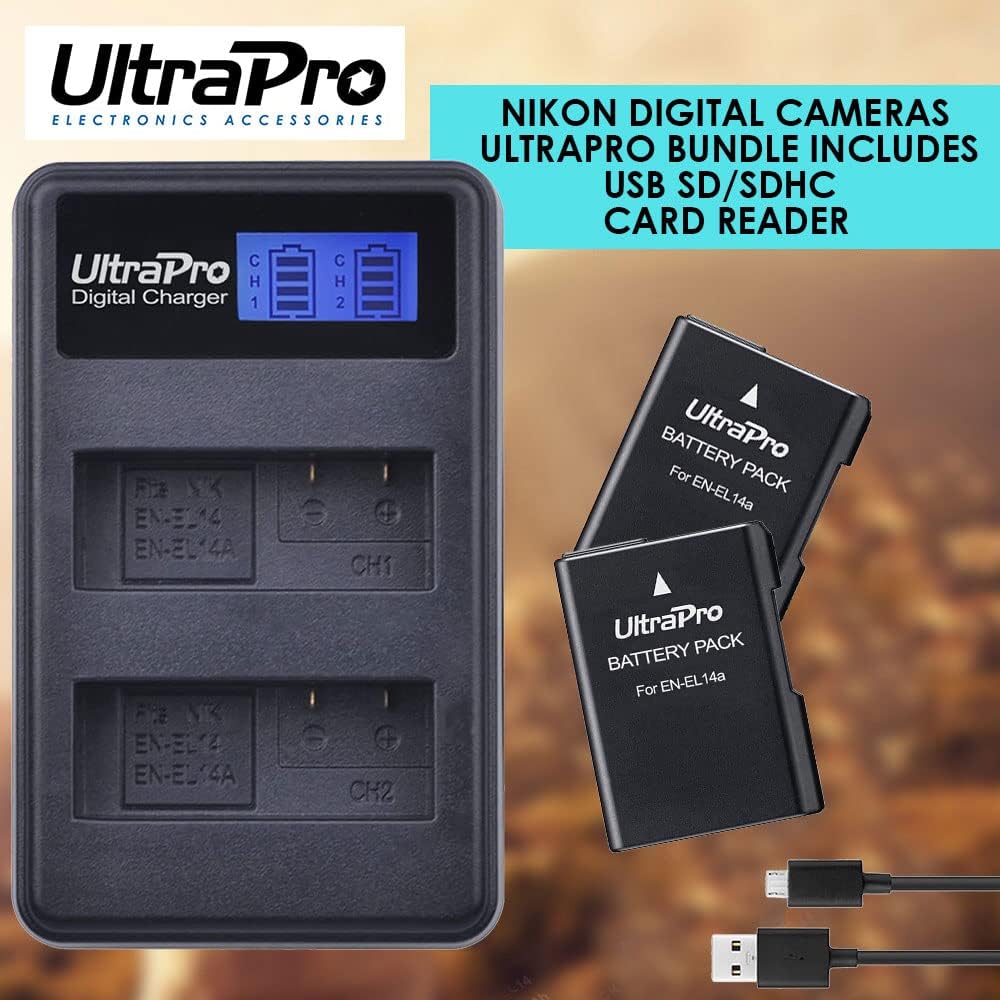 UltraPro 2-Pack EN-EL14 / EN-EL14A / EN-EL14A+ بطارية بديلة عالية السعة مع شاحن LCD مزدوج سريع لكاميرات نيكون الرقمية المختارة تتضمن الحزمة: قارئ بطاقات USB SD/SDHC