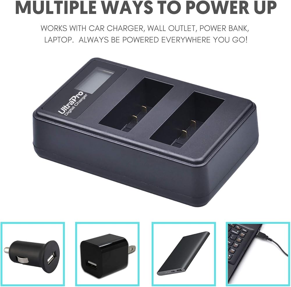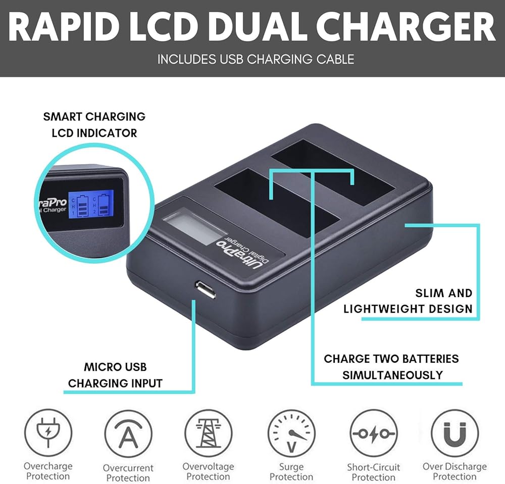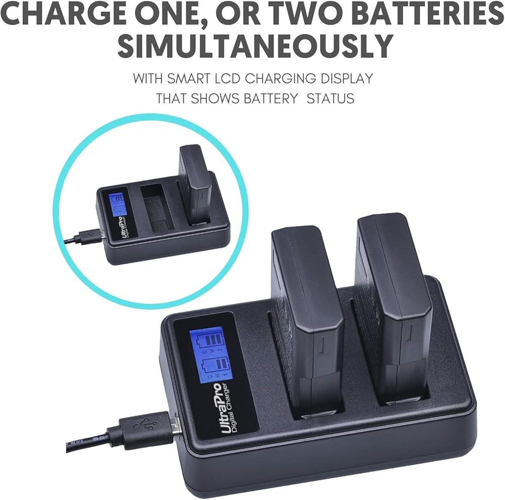 - يتضمن شاحن بطارية LCD مزدوج سريع. مدعوم من USB، يسمح بشحن بطارية واحدة أو بطاريتين في وقت واحد لتوفير الوقت