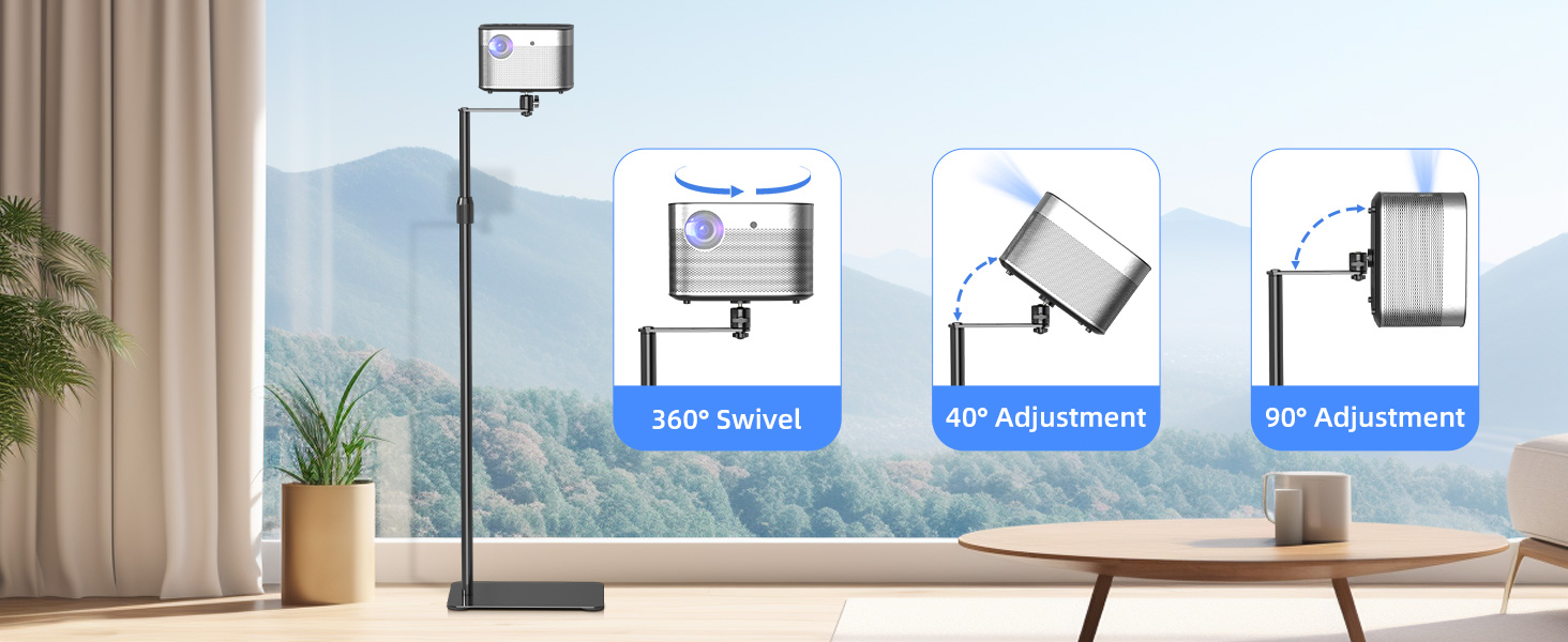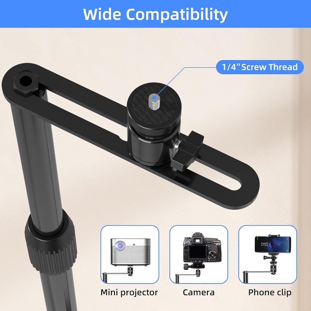 【دوران 360 درجة】- يأتي حامل جهاز العرض برأس كروي عالي الجودة يسمح بدوران أفقي 360 درجة وإمالة 90 درجة. وهذا يوفر المرونة في العرض من أي زاوية، بما في ذلك السقف. باستخدام هذه الميزة، يمكنك بسهولة تغطية كل زاوية تحتاجها لعروضك.