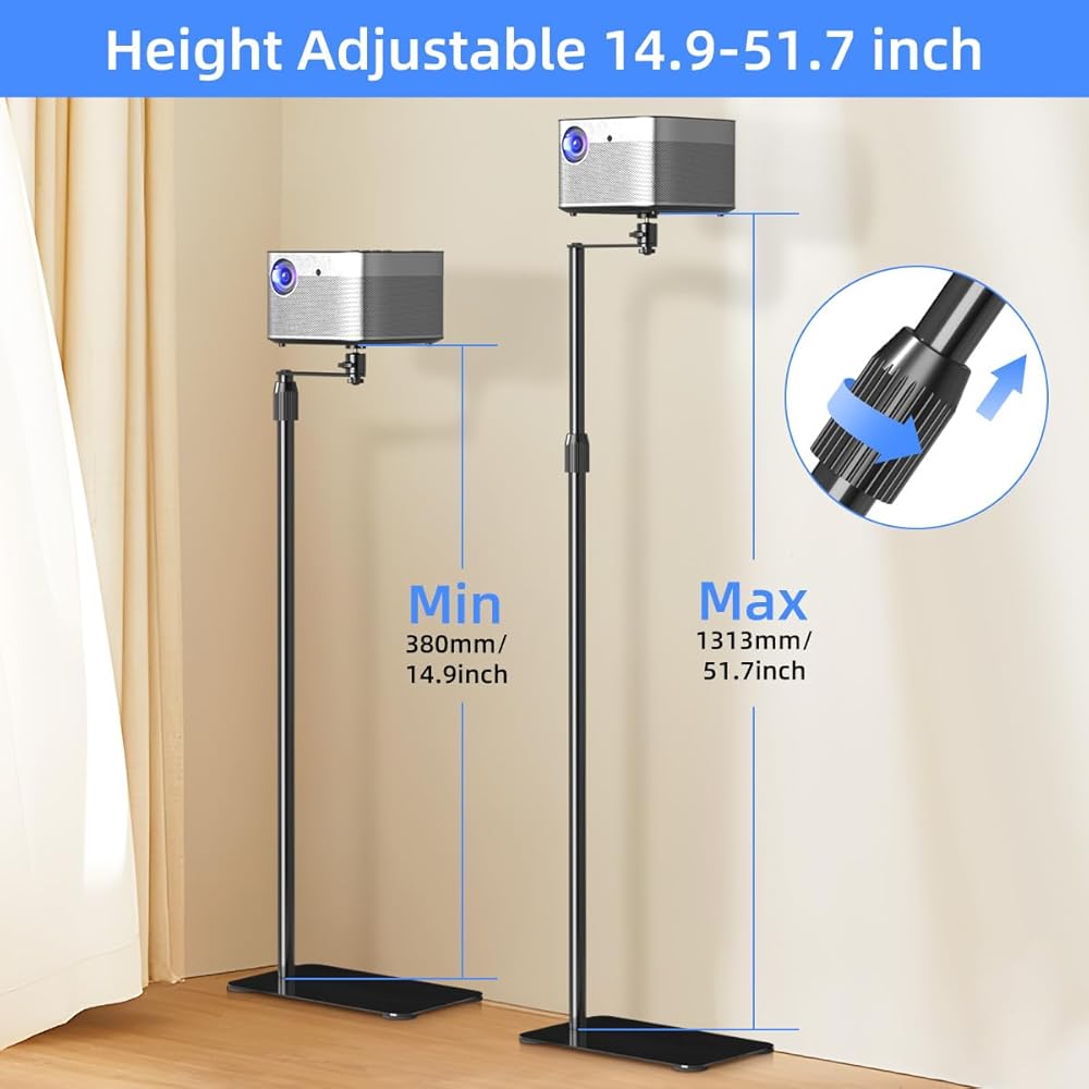 【ارتفاع قابل للتعديل】- تم تصميم حامل جهاز العرض مع وضع إمكانية تعديل الارتفاع في الاعتبار. يمكنه ضبط الارتفاع بسرعة وسهولة من 14.9 بوصة إلى 51.7 بوصة حسب احتياجاتك. يتيح لك ذلك تحقيق زاوية مشاهدة مريحة ويضمن الأداء الأمثل للجهاز. تعمل المقابض ذات المشبك القابلة لضبط الارتفاع على تثبيت الحامل في موضعه بشكل آمن.