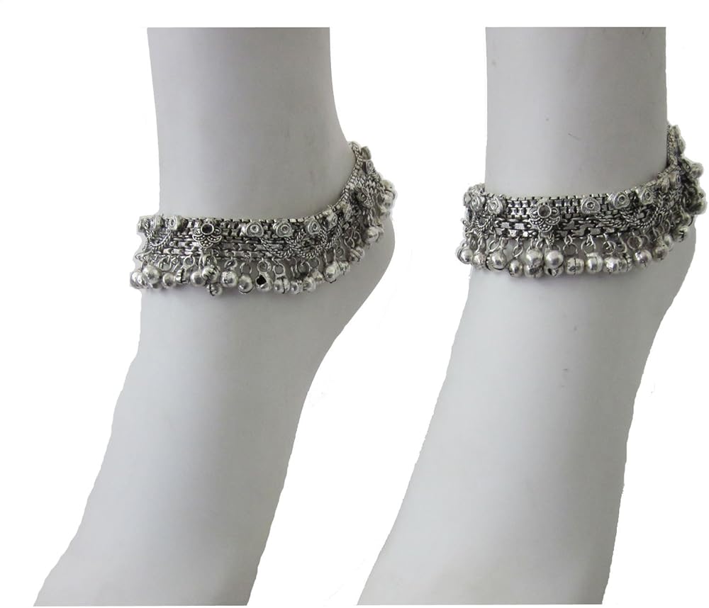 زوج خلخال سلسلة بطبقات لحام يدوي من النحاس المطلي بالفضة المؤكسدة، مصنوع يدويًا في الهند على يد حرفيين بحب وعمل