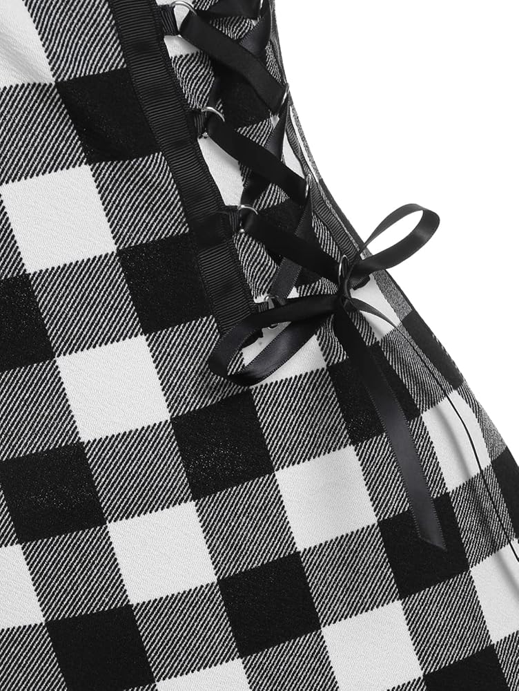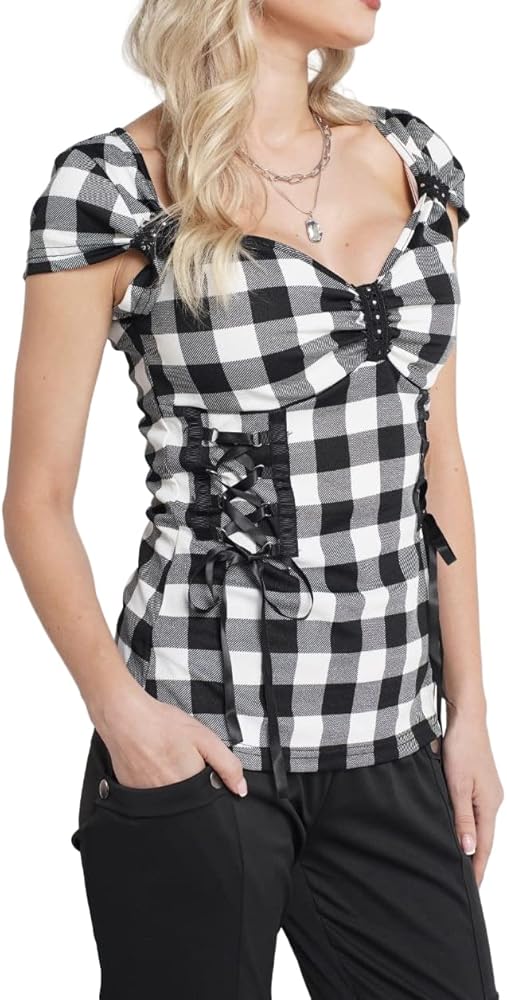 【Gothic Women's Tops】 The trendy checkerboard pattern animates the sweetheart neck shirt, create an gothic casual look, you'll love with it!