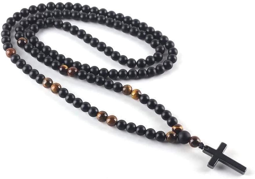 LG Gifts Ltd. قلادة متقاطعة من خرزة عين النمر الأسود والهيماتيت للرجال والنساء المسيحيين | هدية دينية مسيحية | مسبحة حبة الصليب قلادة