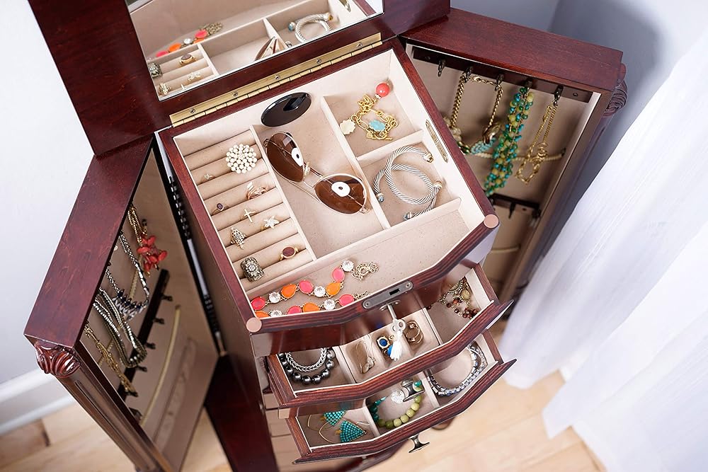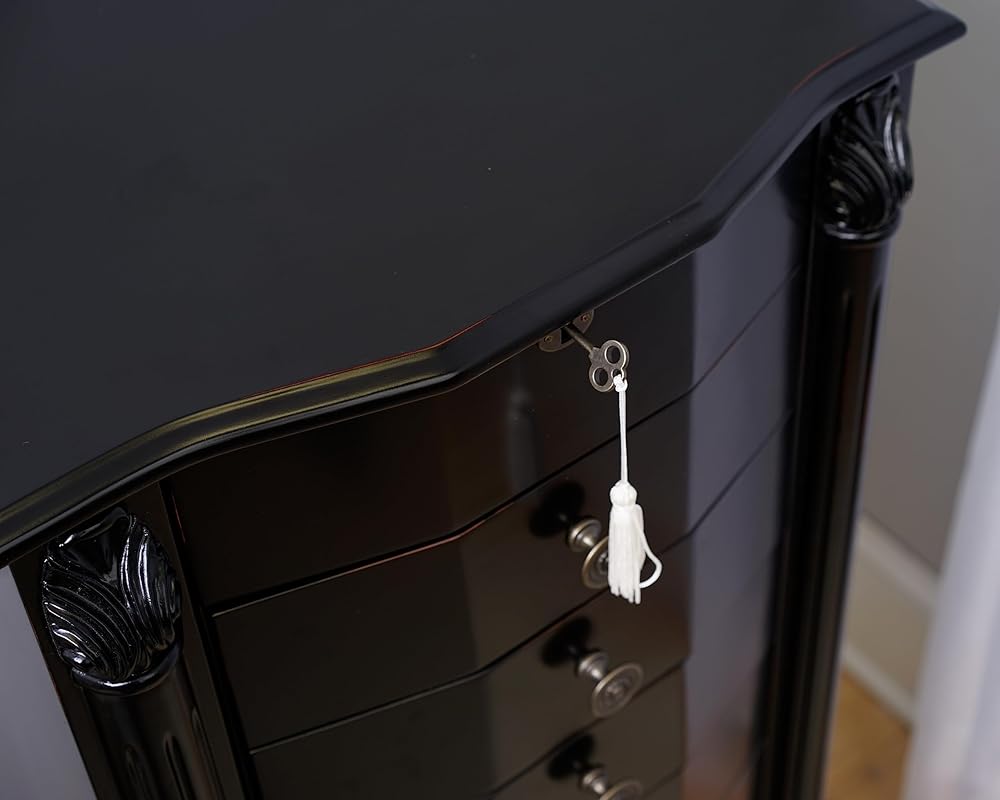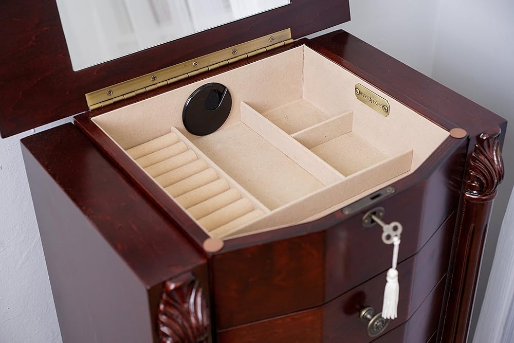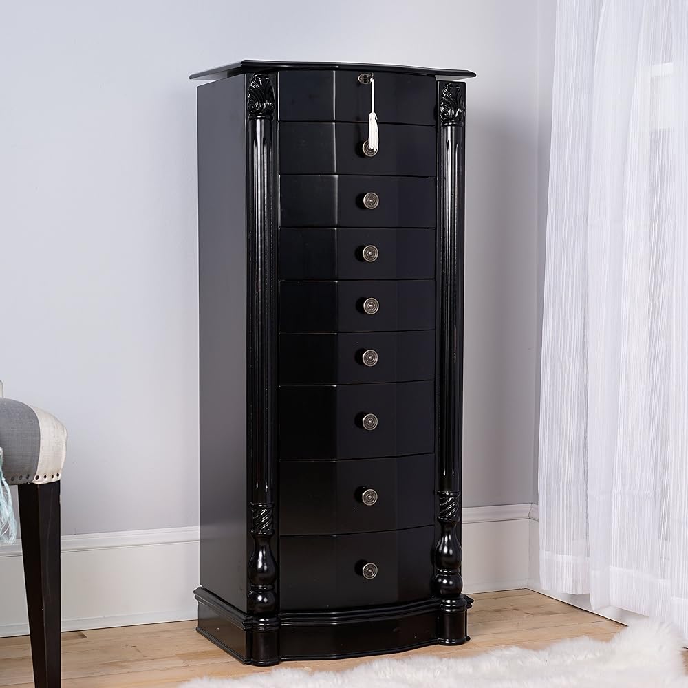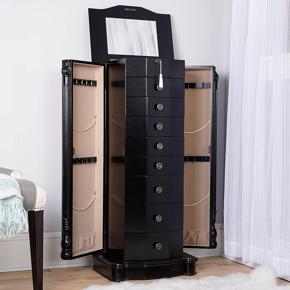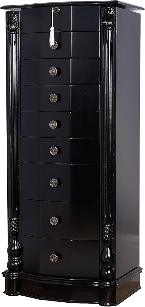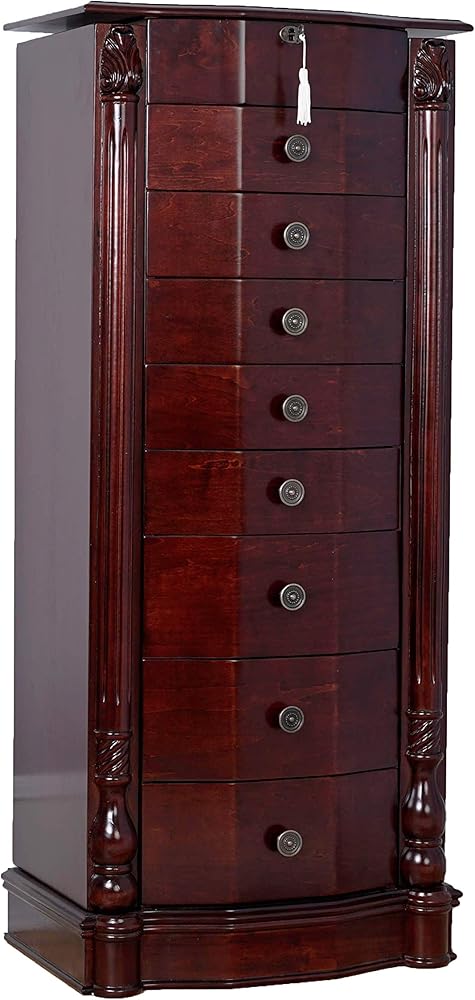 Get ready to make a statement with the Roman Jewelry Armoire! Standing tall at nearly 40 inches, this stunning piece is the perfect way to showcase your beautiful jewelry collection. With 8 pull-out drawers lined with anti-tarnish felt, ring rolls, and divided compartments, you can keep everything organized and protected. Plus, the 2 side panel doors feature 10 double-tiered necklace hooks each, so you can display your favorite necklaces and bracelets with ease. And let's not forget the top that opens to reveal a vanity mirror – perfect for getting ready and taking one last look before heading out. With its rich, walnut finish, the Roman is a true work of art, crafted by the hands of skilled artisans. Get yours today and make a statement!