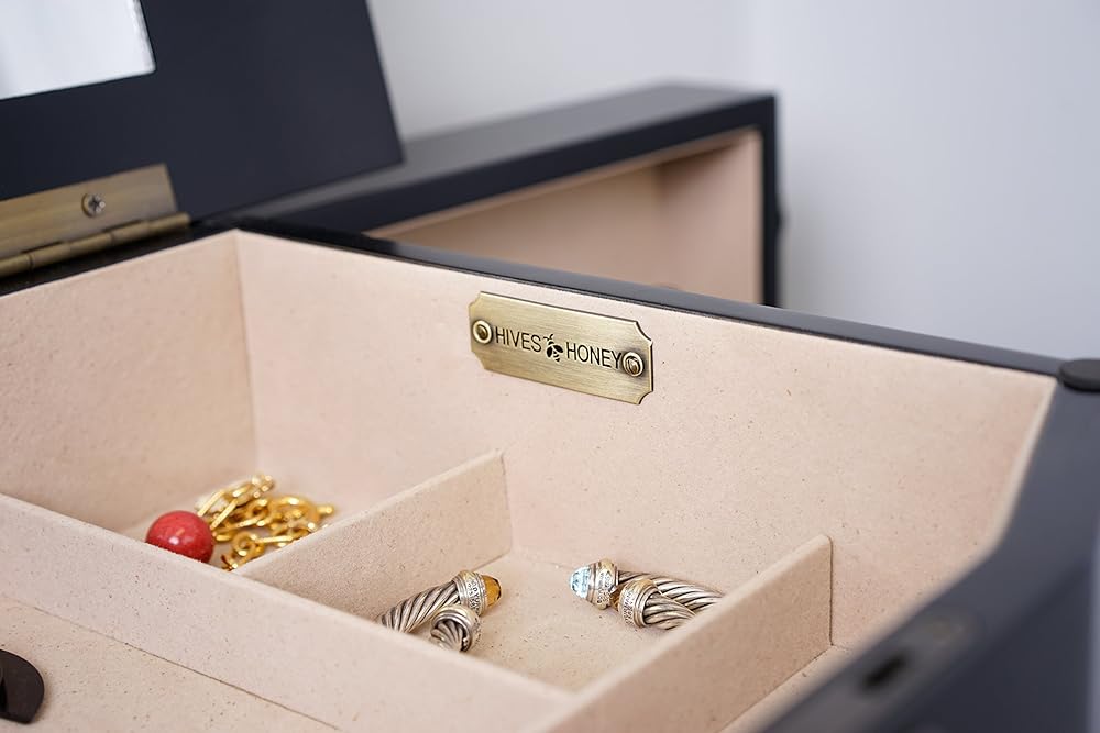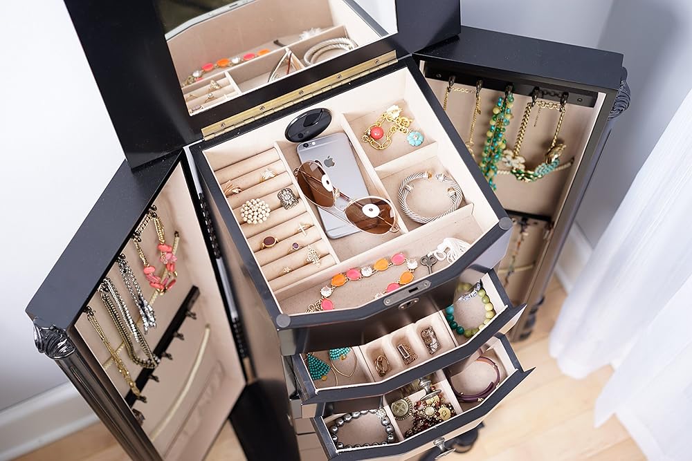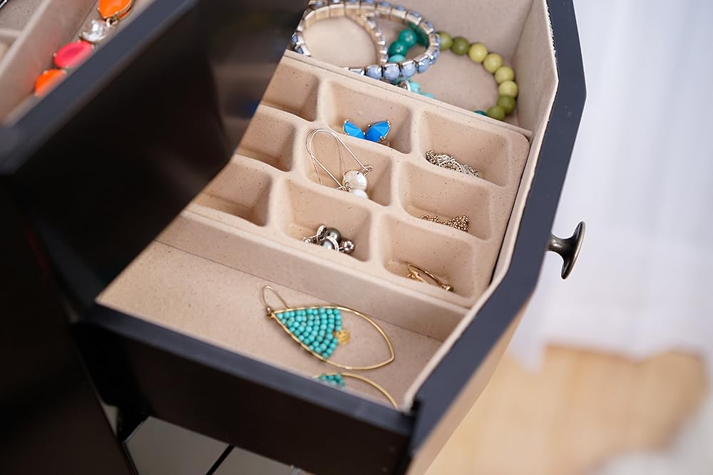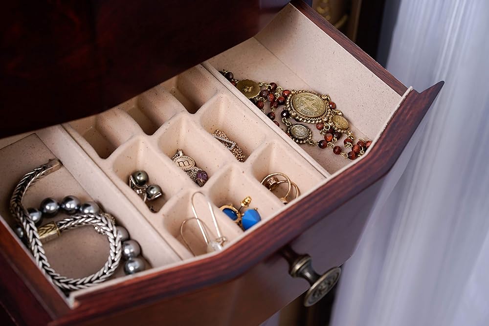 The 8 drawers are lined and padded, with separated compartments to keep small items organized.