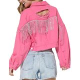 Drop shoulder rhinestone rodeo denim jacket, pink fringe jacket, perfect for street, daily wear, holiday, vacation, office, school, party, dating and daily in spring, fall, autumn and winter