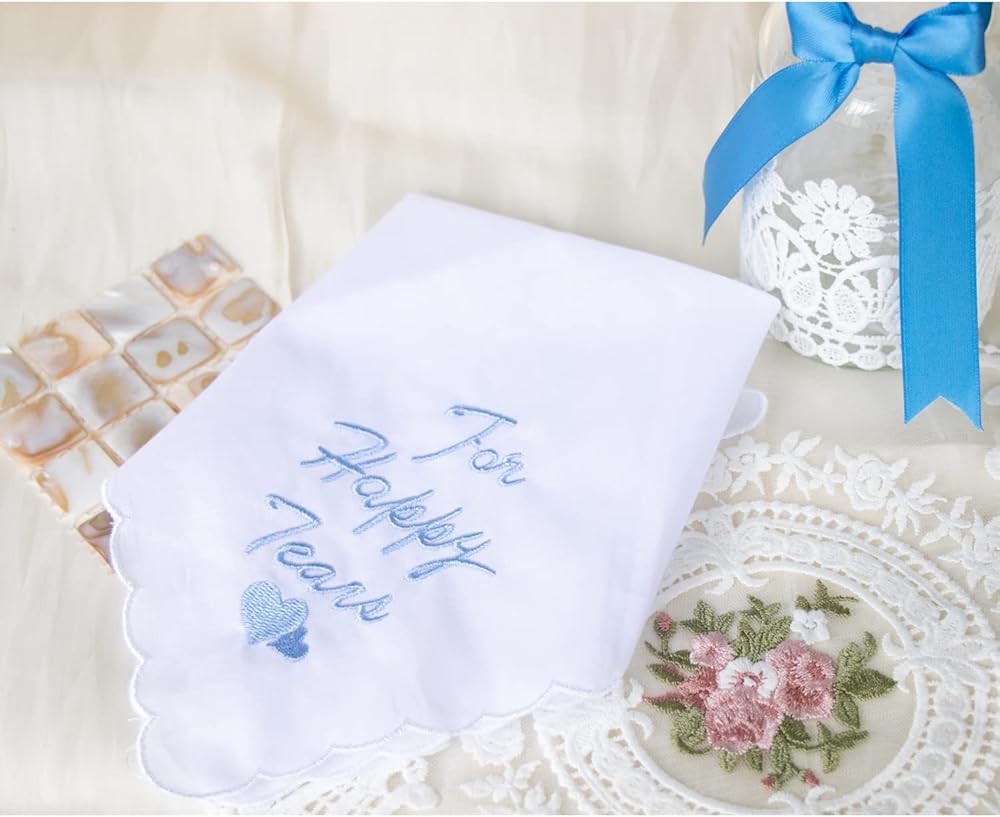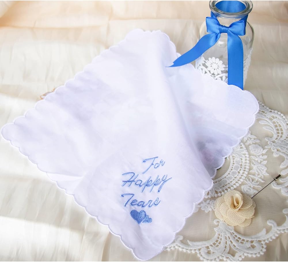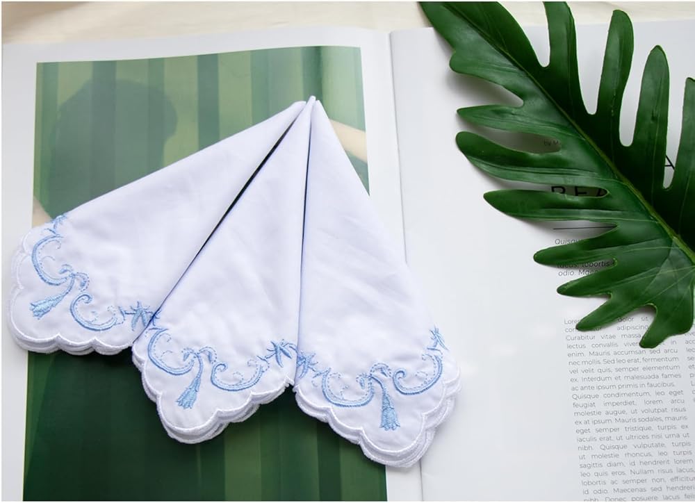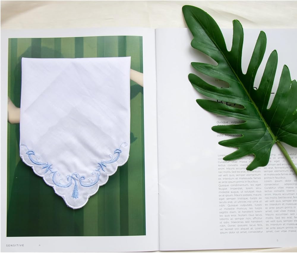 قماش أبيض ناعم مع تفاصيل مطرزة بيضاء دقيقة وأعمال دانتيل؛ تظهر هذه المناديل المطرزة الأناقة التقليدية في أي مناسبة، خاصة في حفلات الزفاف. كما أنها هدية جيدة عندما يأتي عيد ميلاد الآخرين أو العطلة، أو حفل استقبال المولود الجديد، أو دعوة الزفاف، أو بحروف كبيرة، أو تطريز على الأعراس.