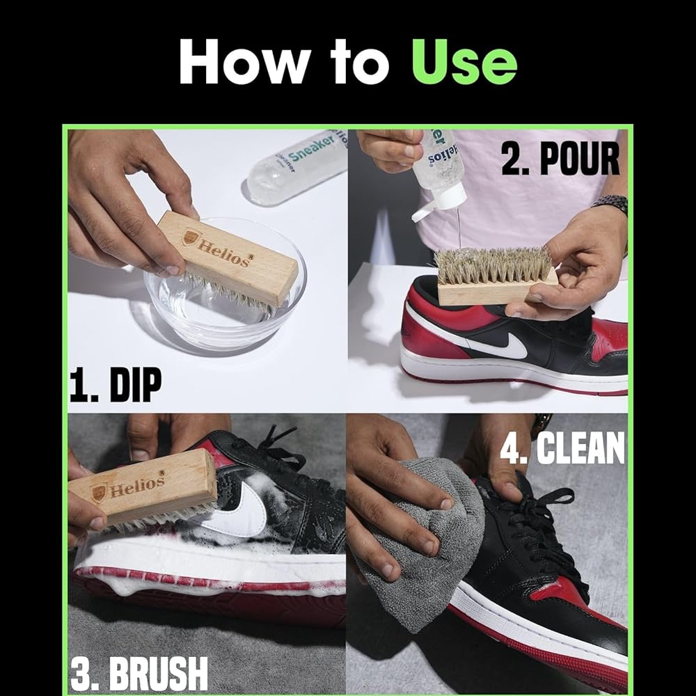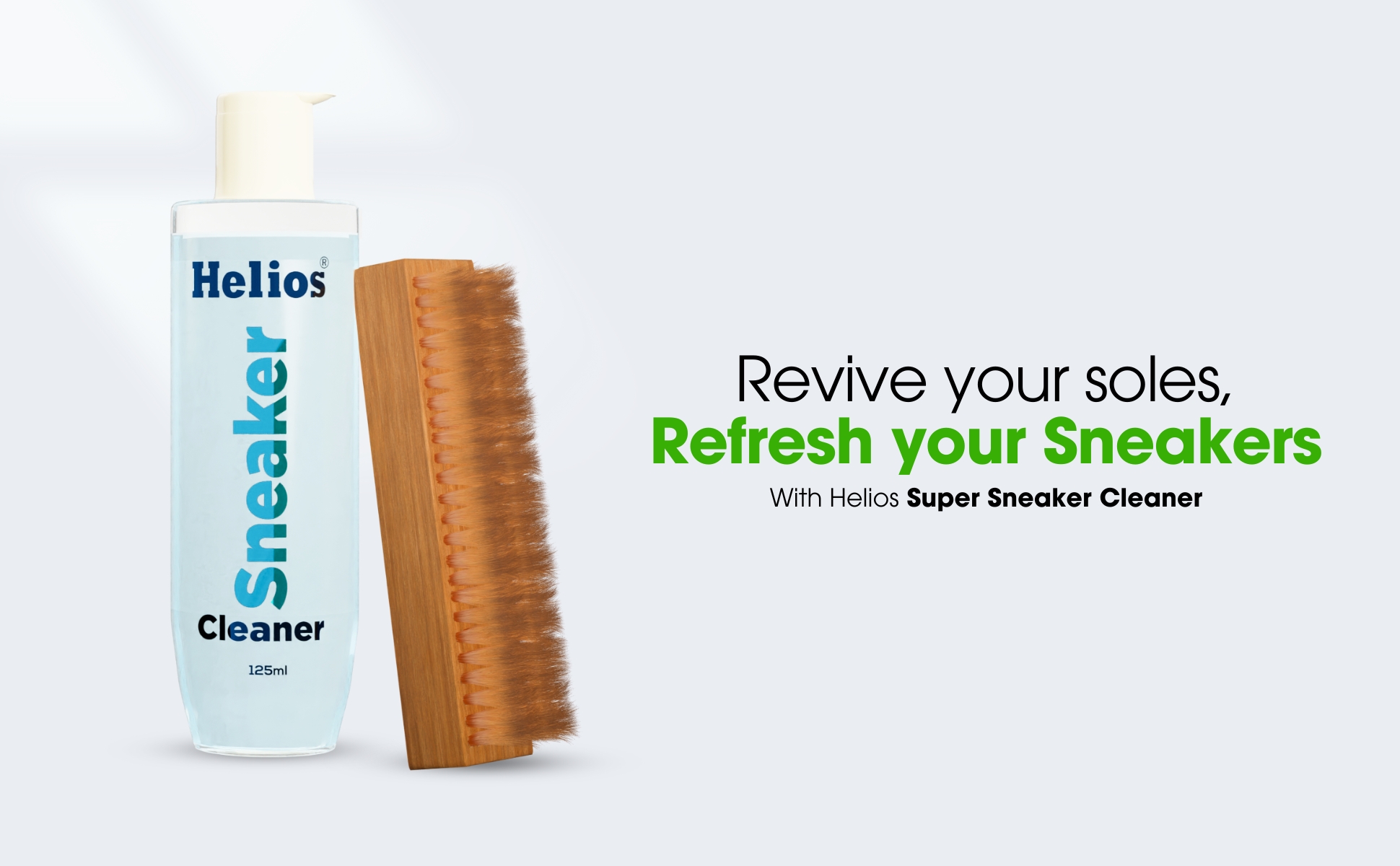 The Helios Super Sneaker Cleaner is our signature product which is the perfect go-to kit for all sneakerheads these days. The kit includes : 1. Premium Sneaker Cleaning Solution :- This gentle foaming solution is packaged in a uniquely designed 125 ml bottle which if used wisely and efficiently can clean up to at least a 100 pair of shoes. The solution is free of any harmful chemicals and abrasives and hence will cause no harm to the surface of your shoes. It is completely safe to be used on sneakers of varied materials like suede, leather mesh, fabric, knit, textile, etc. The solution is very effective in getting rid of grease and oil stains as well. 2. Premium Sneaker Cleaning Brush :- The brush is made of premium steam beech wood which has been beautifully engraved giving it a stylish as well as an elegant look. The delicate but strong natural bristles of the Premium Sneaker Cleaning Brush make it safe to be used on all materials like suede, leather, mesh, fabric, knit etc. Another very classic feature of this brush is the great liquid holding capacity of the bristles which does not allow the cleaning solution to drip unnecessarily causing its wastage. The bristles can also absorb about 65% more water than any brush with artificial fibers would. This brush is ideal for cleaning the midsole and under sole of shoes. Being manufactured with gold standards, be rest assured that the bristles of the brush will not wear out over time.