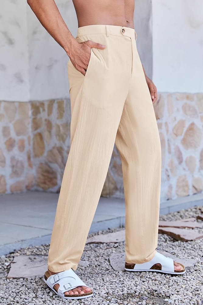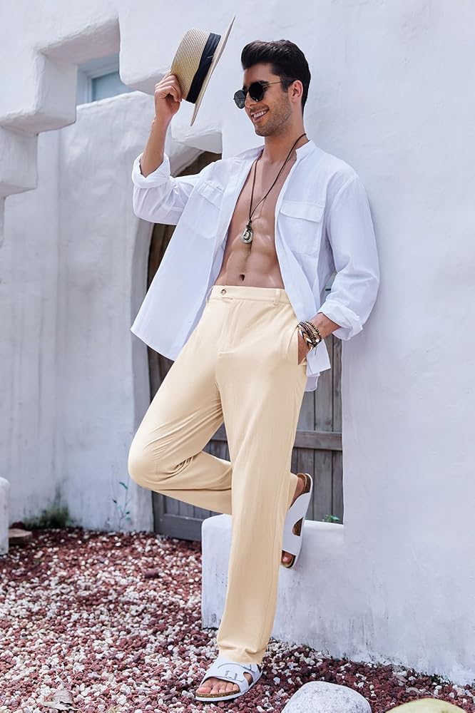 Variety Matches: Create a more outstanding look, you can try these simple solid trousers with a linen shirt or a white t-shirt, vest, hawaiian shirts, sneakers, sandal, canvas shoes, flip flops and so on.