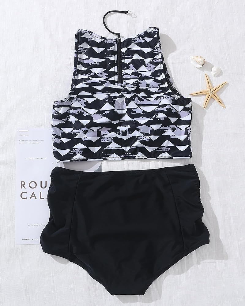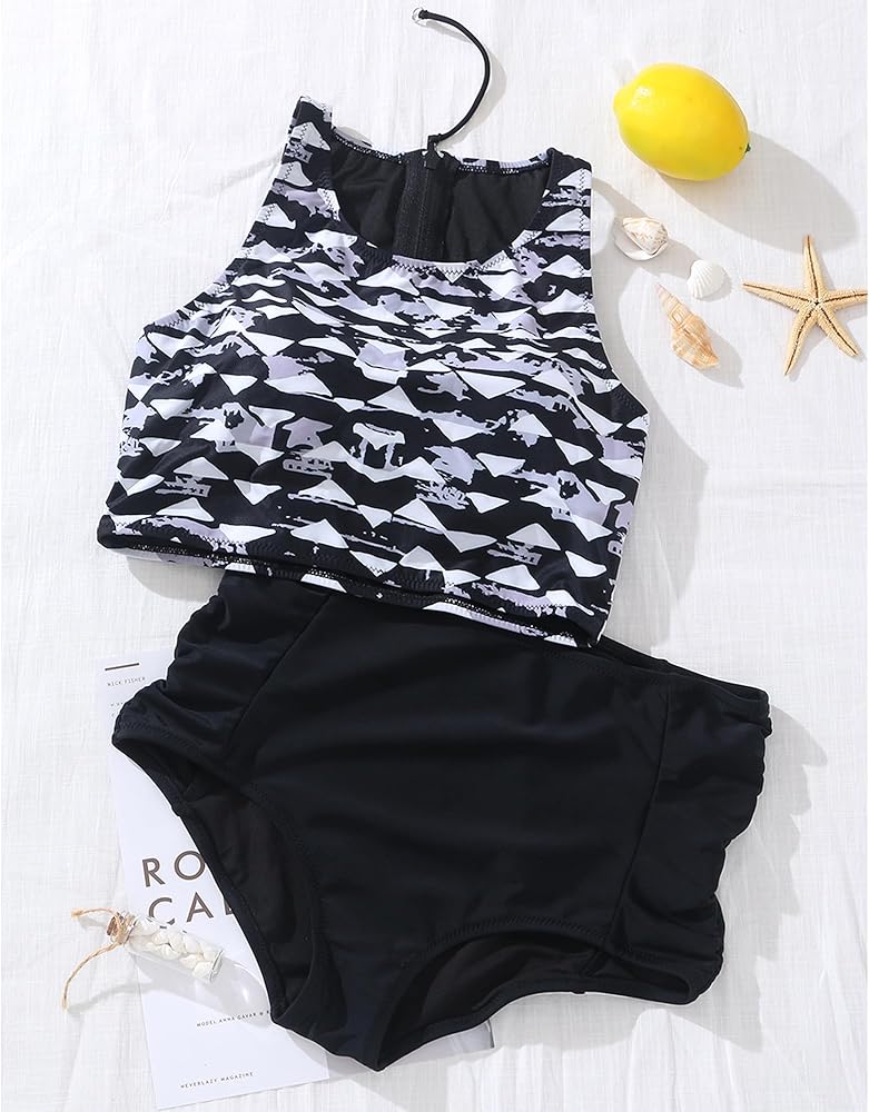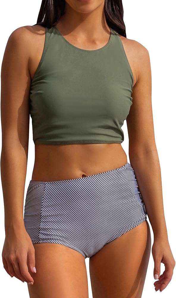 • ملابس سباحة نسائية رياضية مكونة من قطعتين --- طقم بيكيني برقبة عالية، بدلة سباحة بظهر متسابق، جزء سفلي بيكيني مكشكش، جزء علوي بيكيني قصير، مبطن لدعم ثوب السباحة هذا، إنه ثوب سباحة عالي الخصر، ثوب سباحة للتحكم في البطن من قطعتين، ملابس السباحة الرياضية هذه لها ظهر كامل مع تغطية خلفية متوسطة وخط أسفل الساق. هذه بدلة استحمام لطيفة، بدلة سباحة للفتيات والنساء المراهقات.
