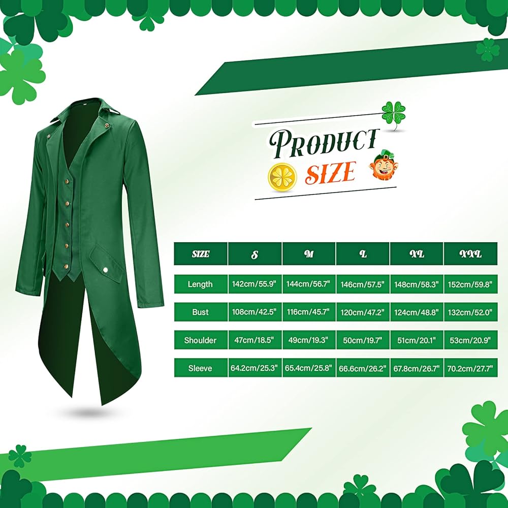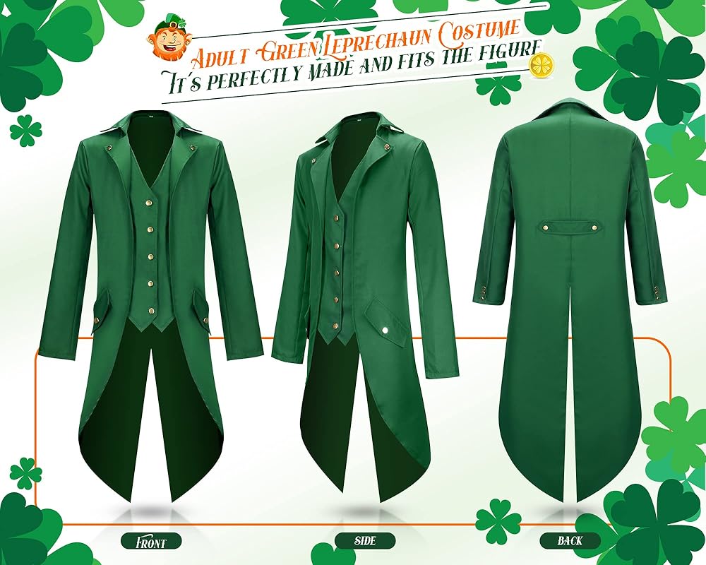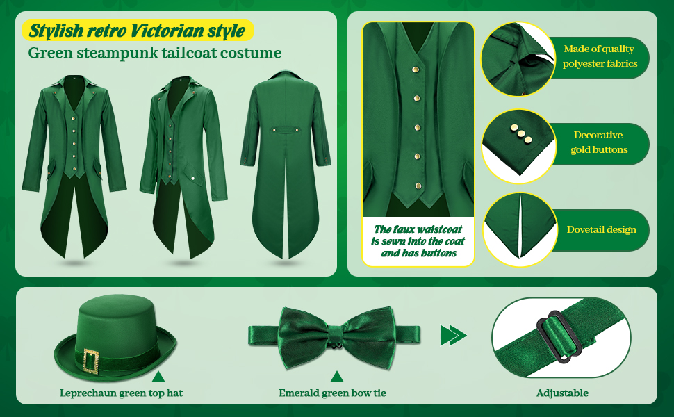 • تشمل العبوة: يأتي زي البالغين هذا مع زي معطف ذيل Steampunk أخضر، وقبعة علوية خضراء اللون وربطة عنق خضراء زمردية معًا؛ يمكنهم مساعدتك في خلق شعور بشخصية كرتونية تبدو وكأنها متشيطن حقيقي؛ بدلة شامروك هذه مناسبة جدًا للعرض