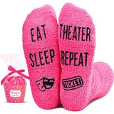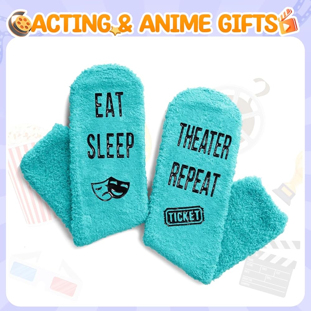 TERTER SOCKS: These blue socks are decorated with a tragicomic mask and tickets. Additionally, the socks are printed with the funny saying "EAT SLEEP THEATER REPEAT".