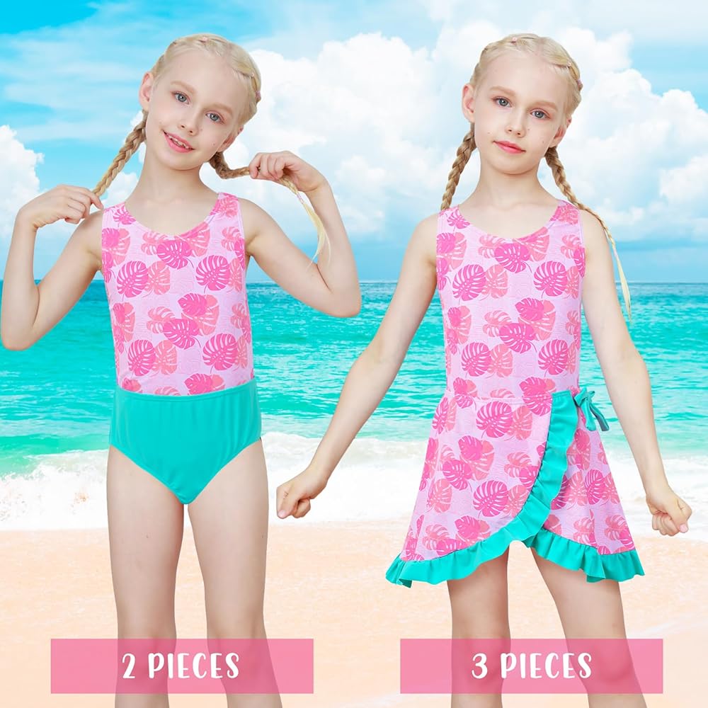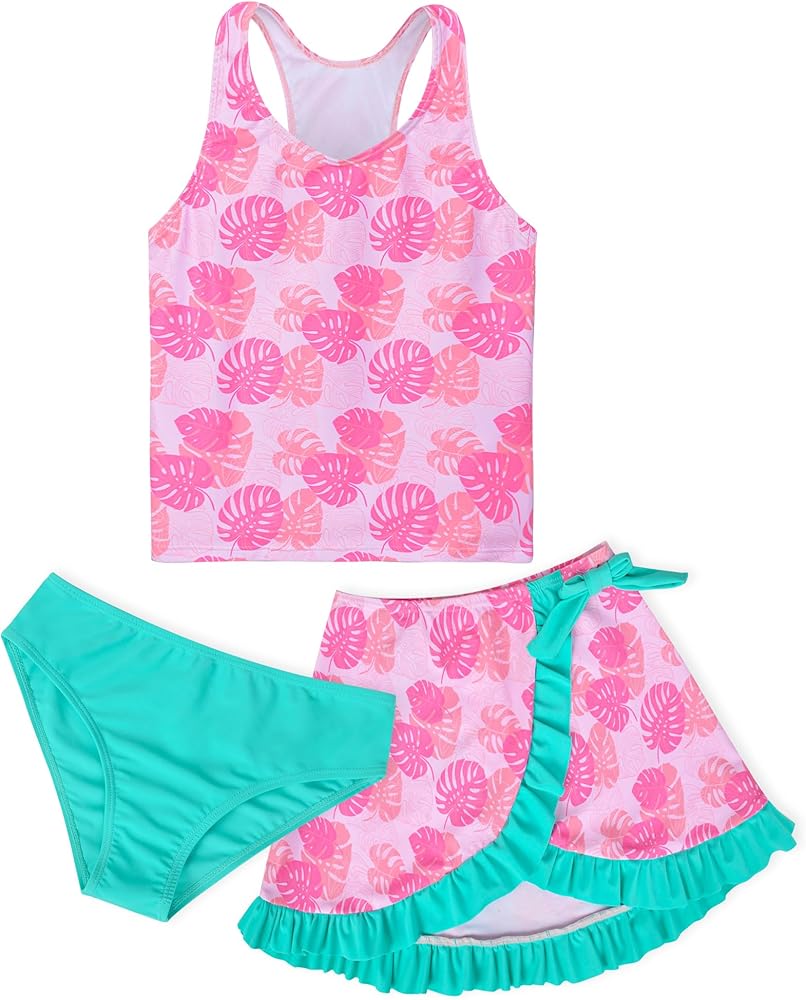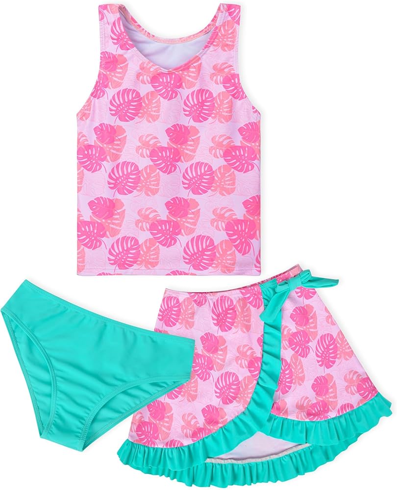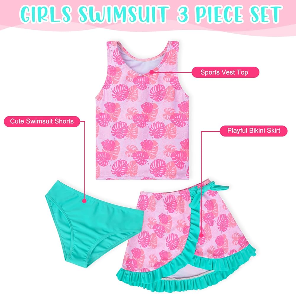 • Girls' 3 Pcs Swimsuit Set】The girls swim suits set includes a tankini, briefs and a beach skirt. These three pieces can be matched separately or combined together, making them versatile and fashionable.