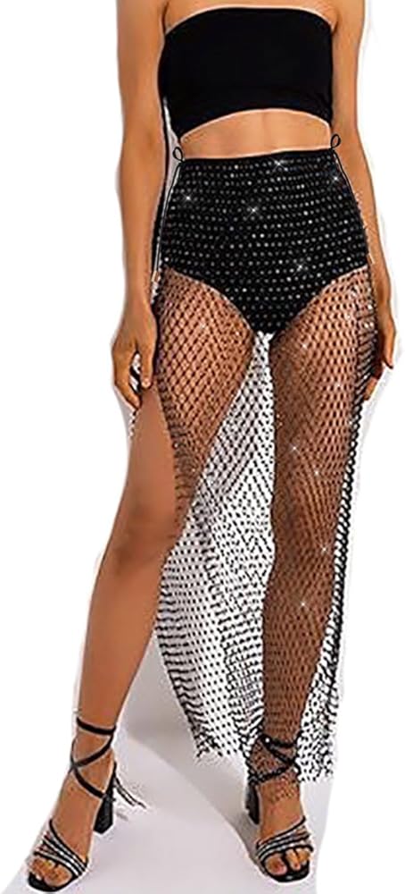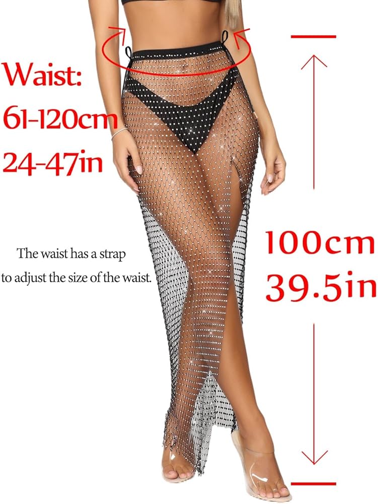 Size: Rhinestone Fishnet Cover Up Skirt: Skirt length 39.5in/100cm, Waist 24-47in/61-120cm. There are two 110cm straps on the waist. You can adjust the tightness of the waist through the straps. In addition, if you feel that the waist drawstring is a little long, you can use scissors to cut off the excess.