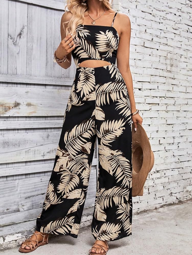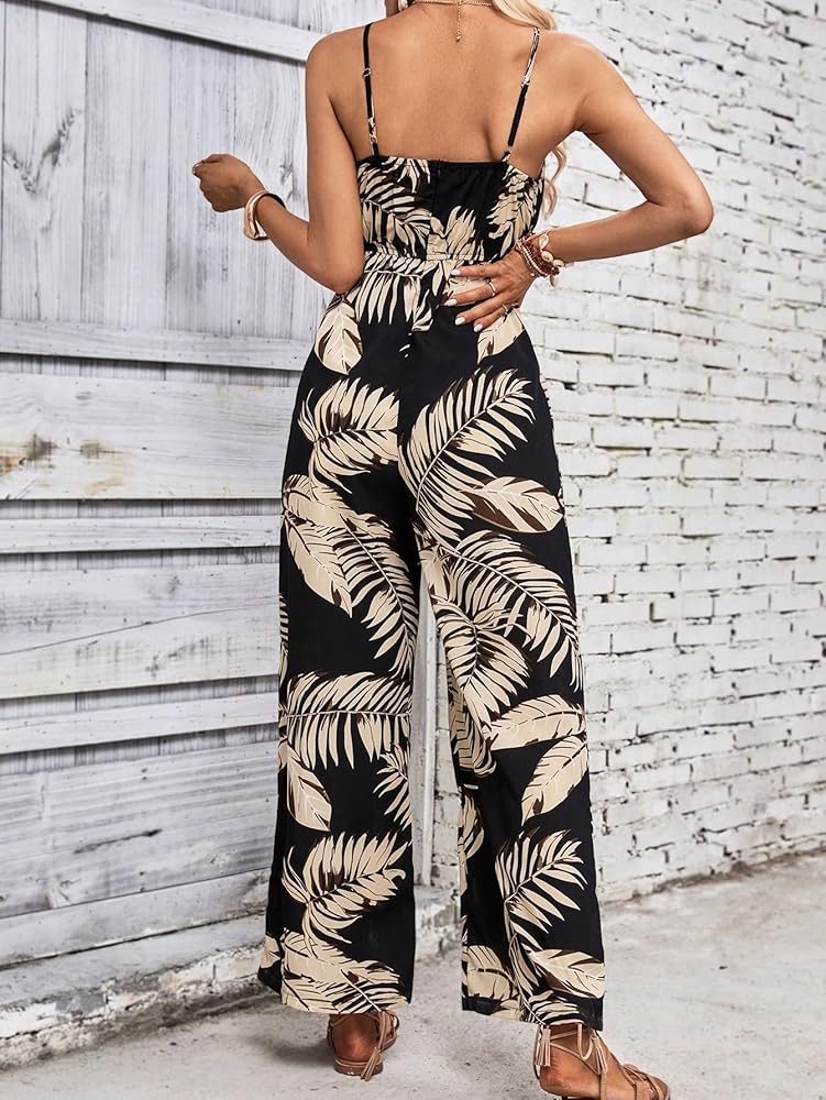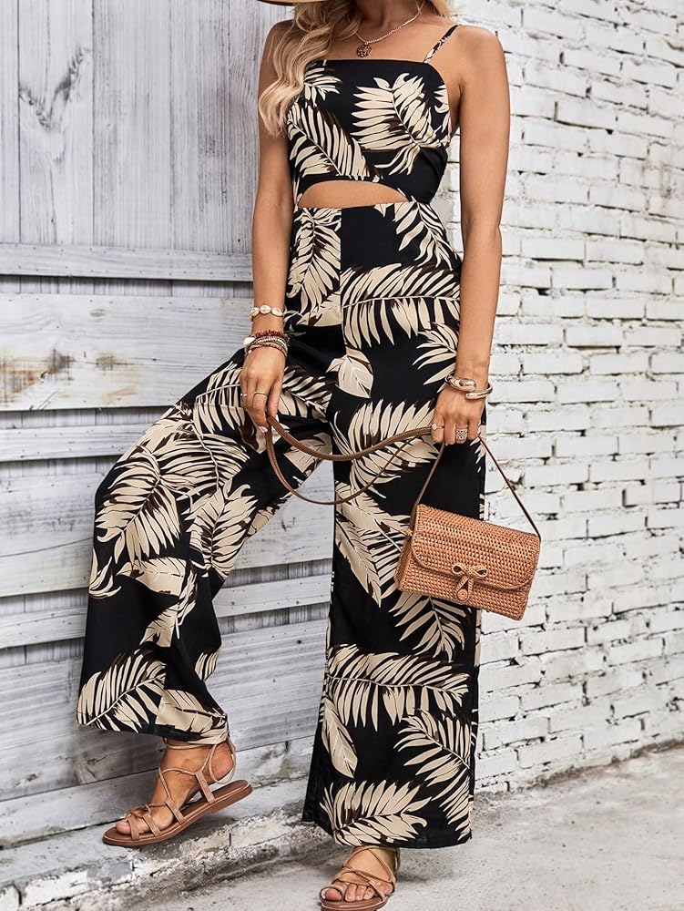 - المزايا: حزام سباغيتي، طباعة استوائية، مقصوص من الأمام، بدون أكمام، ساق واسعة، سراويل طويلة، بذلات نسائية، عصرية