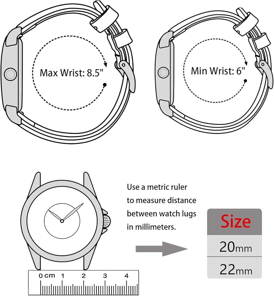 [حدد العرض]: متوافق مع معظم الساعات التقليدية أو الساعات الذكية التي تستخدم قضبان زنبركية 20 مم/22 مم. من المهم التحقق مرة أخرى من عرض عروة ساعتك ومطابقتها تمامًا. يرجى استخدام مسطرة لقياس مكان التقاء الحزام بعلبة الساعة. يمكنك أيضًا العثور على مواصفات معظم الساعات من خلال البحث عبر الإنترنت.