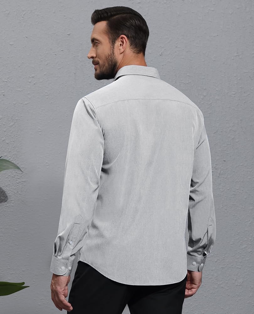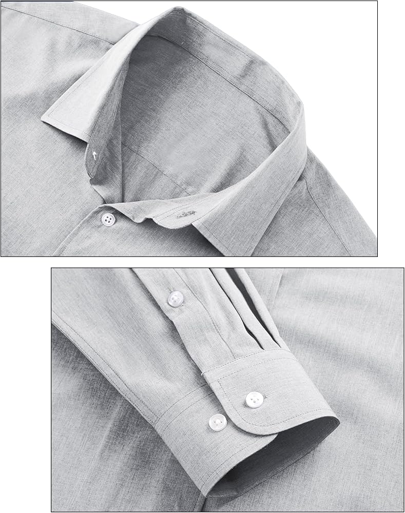 خالية من التجاعيد - مزيج من الأقمشة عالية الجودة والتكنولوجيا الخاصة يجعل القمصان الرجالية غير سهلة التجاعيد وسهلة العناية. القميص الرجالي المصنوع من الكتان بياقة كلاسيكية منتشرة يمكن أن تتطابق بسهولة مع ربطة عنق أو ربطة عنق.
