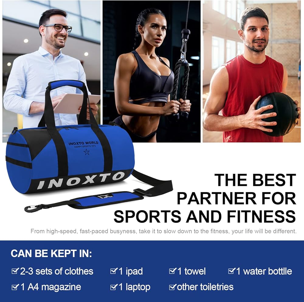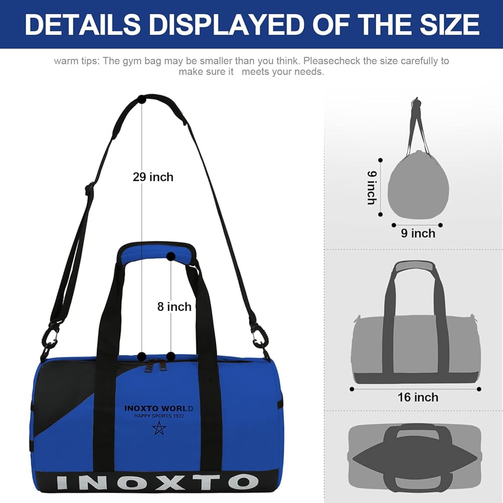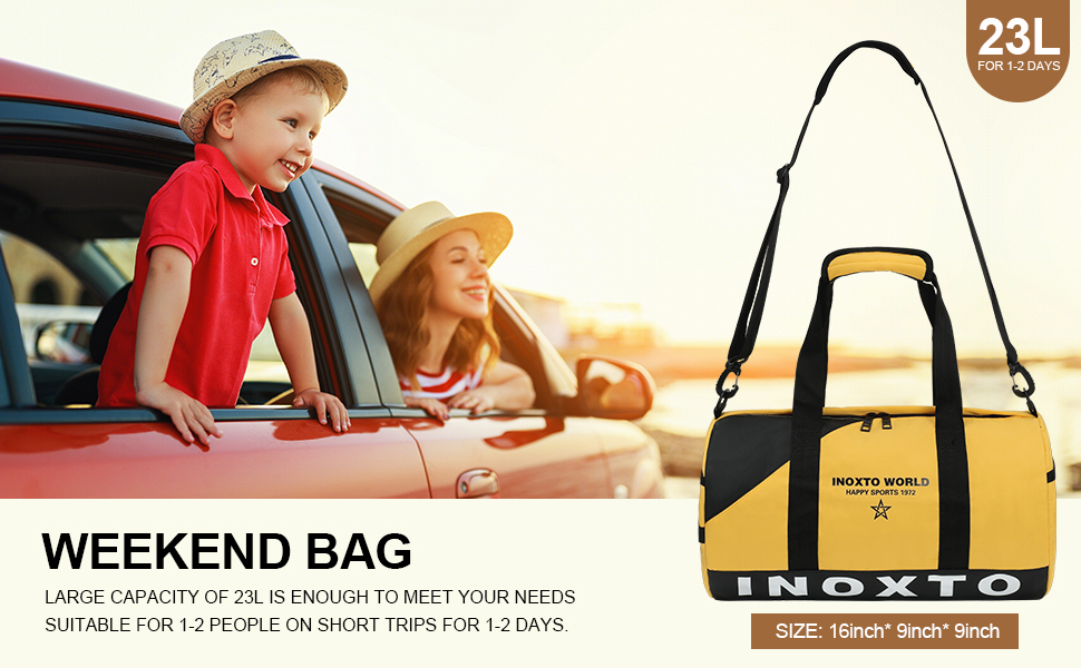 ❤️【SMALL DUFFLE BAG & LIGHTWEIGHT 】The size of Inoxto 's overnight duffle bags is 15.75*9.45*9.45 inches and the capacity is 23L. Weights only 1.3 lbs, which is 40% lighter than traditional gym bag. This sports duffel bag can hold clothes, iPad, cosmetics, shoes, towels, sports products and travel essentials.