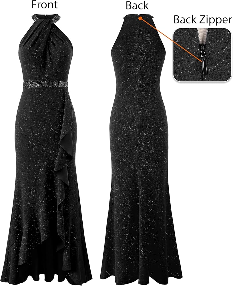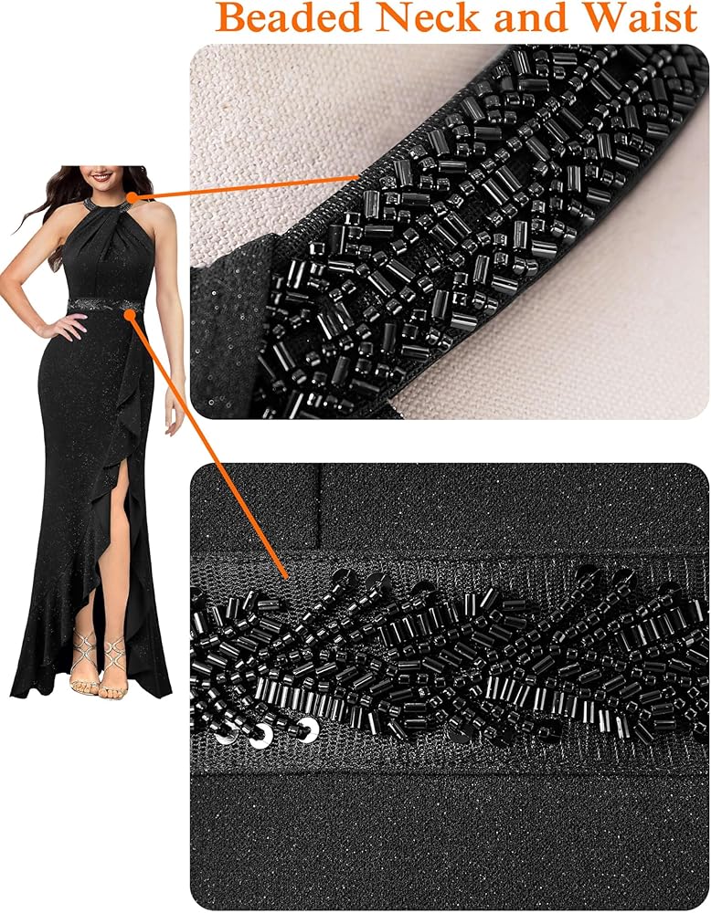 النمط: رقبة رسن مع عقدة ملتوية مكشكشة، خرز وترتر مزين عند الخصر والرسن، سحاب خلفي مخفي مع خطاف وعين للإغلاق، مقاس نحيف، صورة ظلية لحورية البحر، طول طويل، فتحة عالية من الأمام مع كشكشة غير متماثلة.