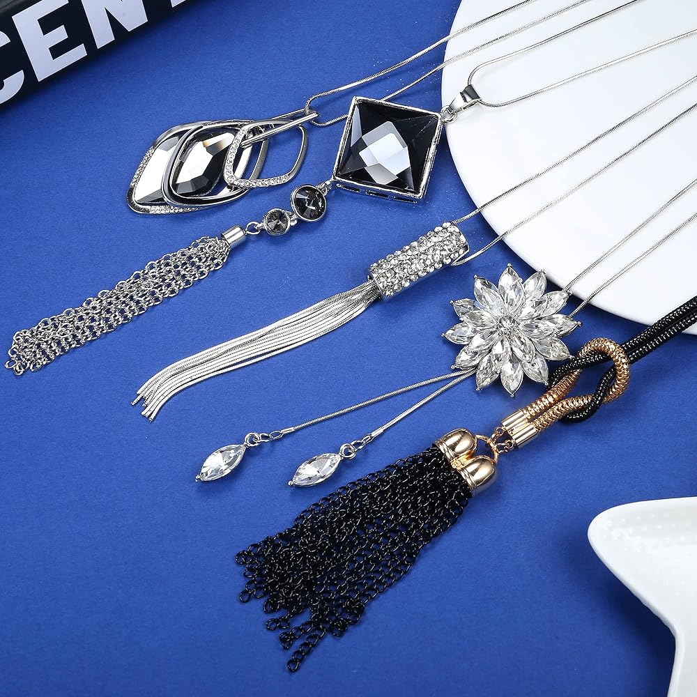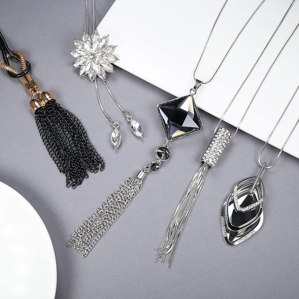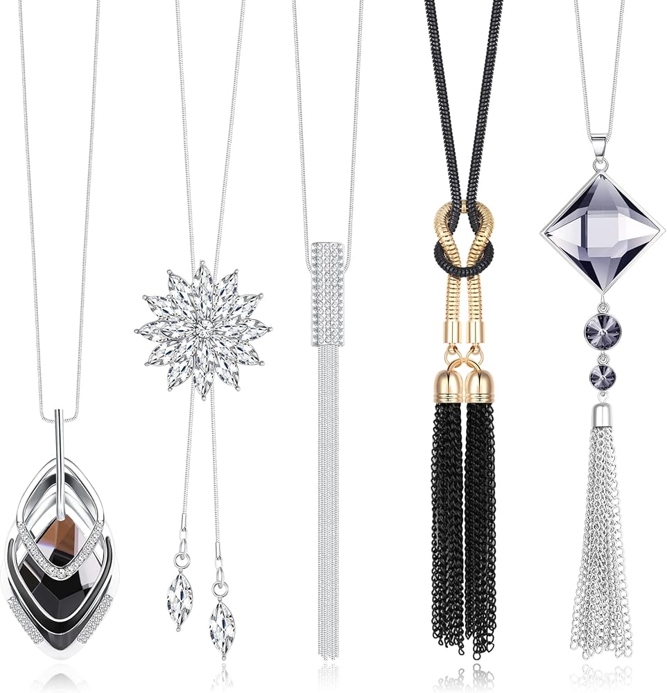مجموعة قلادات طويلة: 5 قطع قلادة طويلة مطلية بالفضة في مجموعة واحدة، العديد من الأنماط المختلفة بما في ذلك، مثل: قلادة كريستال، قلادة شرابة، قلادة زهرة، قلادة ثلاثية المكدس من الزركونيا المكعبة، إلخ.