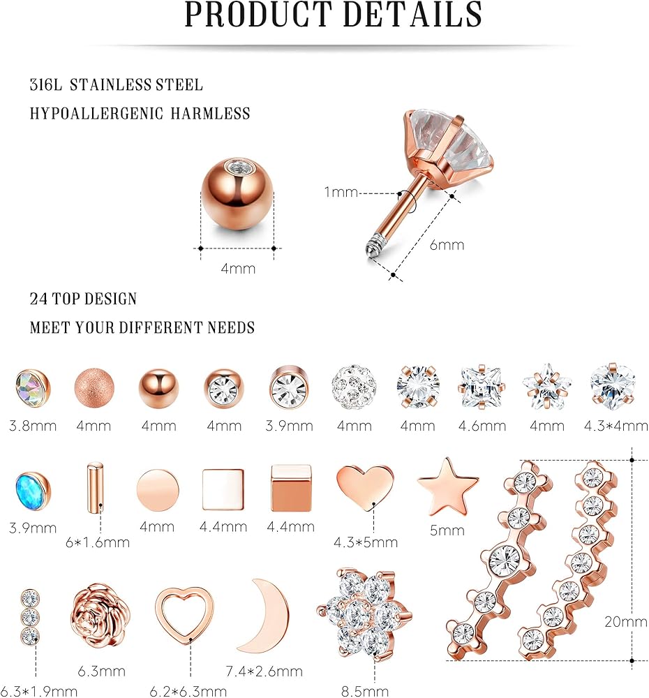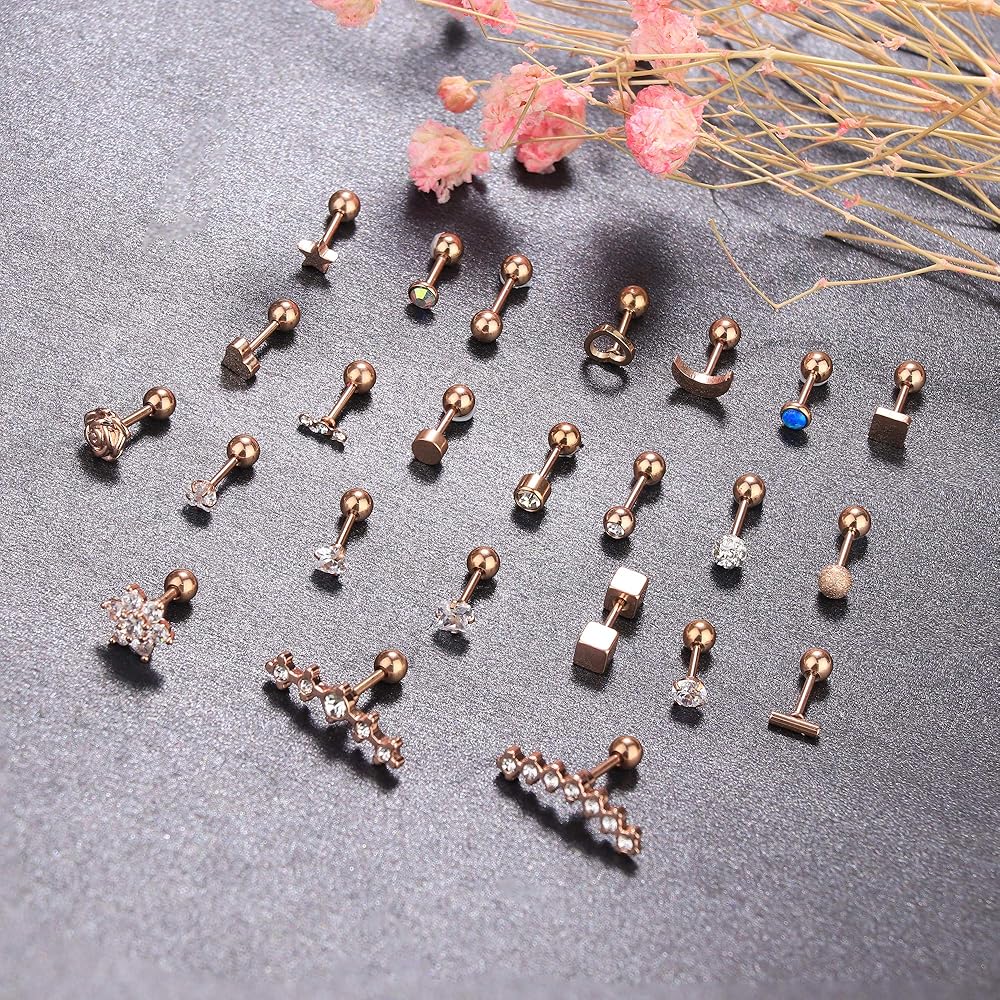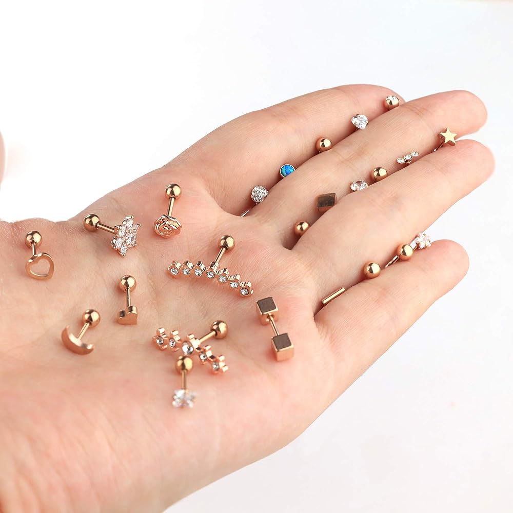 أقراط الغضروف - طلب واحد يحتوي على 24 قطعة من أقراط الغضروف المصنوعة من الفولاذ المقاوم للصدأ بأنماط مختلفة: الزاحف، الزهرة، الحديد، تشيكوسلوفاكيا، القلب، النجمة، القمر، الورد، البار، المكعب وغيرها الكثير. لون فضي ولون ذهبي وردي لتختار من بينها. توفر التصميمات والألوان المختلفة خيارات مختلفة لملابسك.