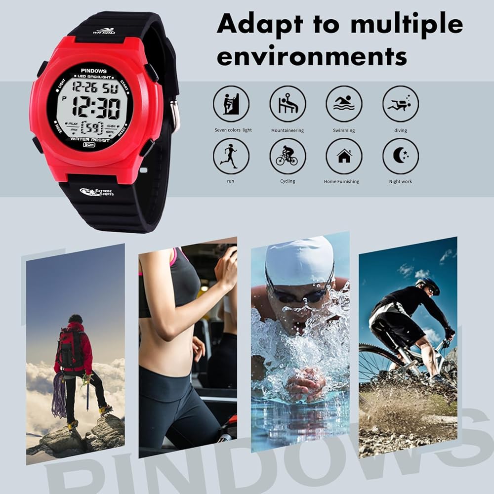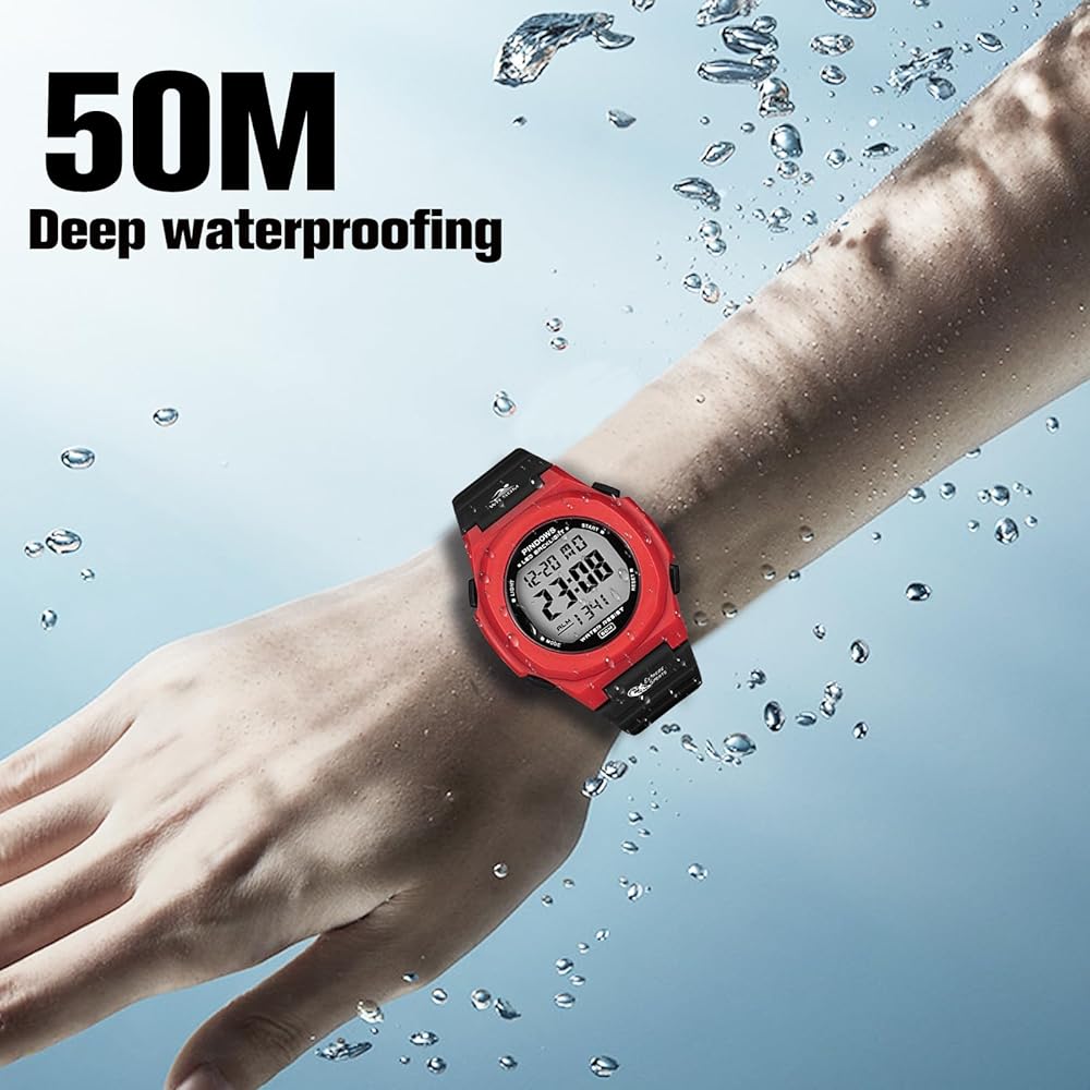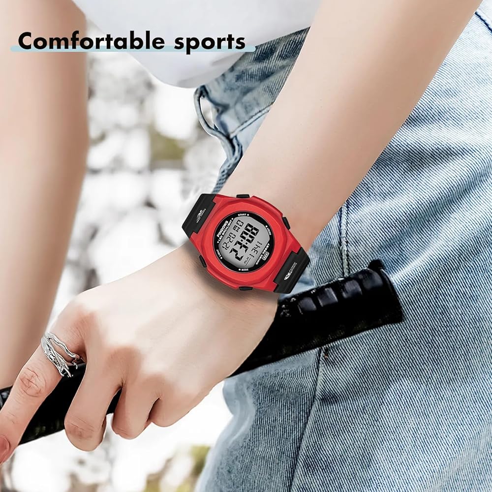 【متعدد الوظائف】مقاومة للماء بدقة تصل إلى 50 مترًا، إضاءة خلفية LED، منبه، نظام 12/24 ساعة، تقويم تلقائي، منبه كل ساعة، وتوقيت ساعة التوقف يجعلها مثالية للأنشطة المختلفة.