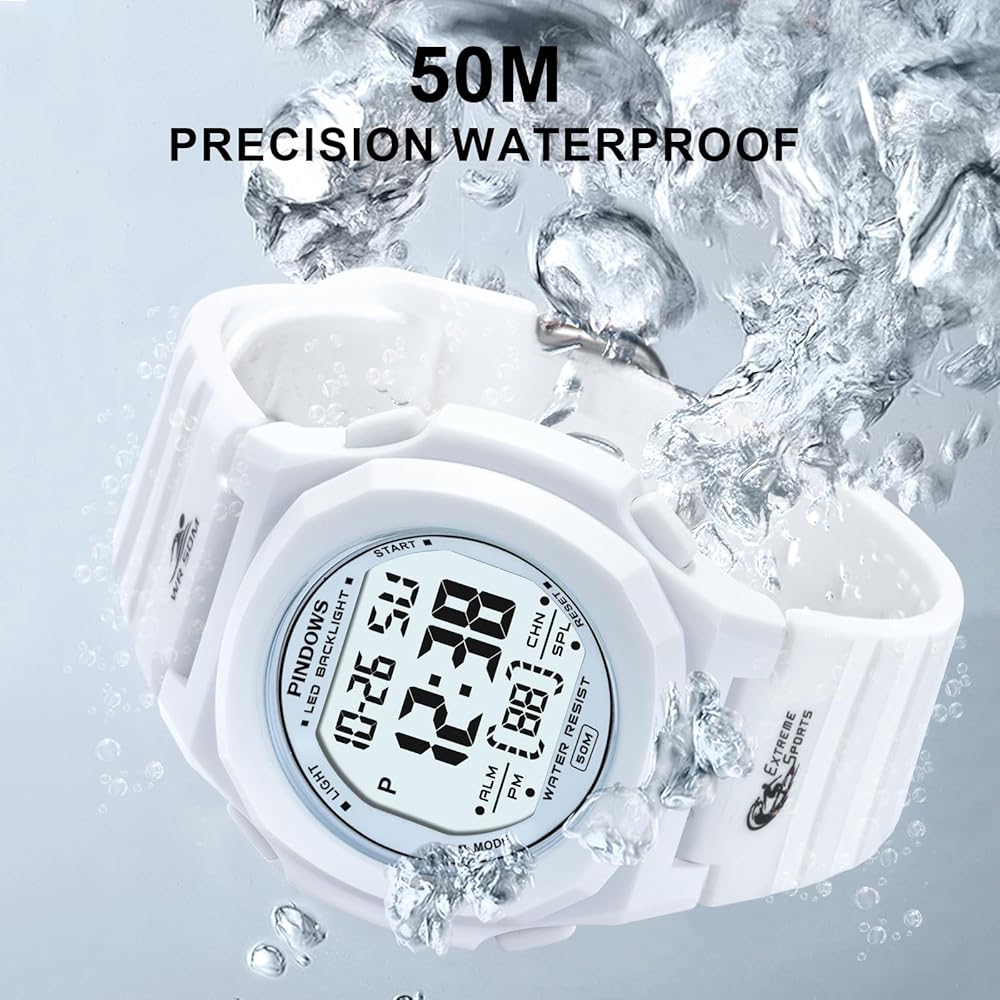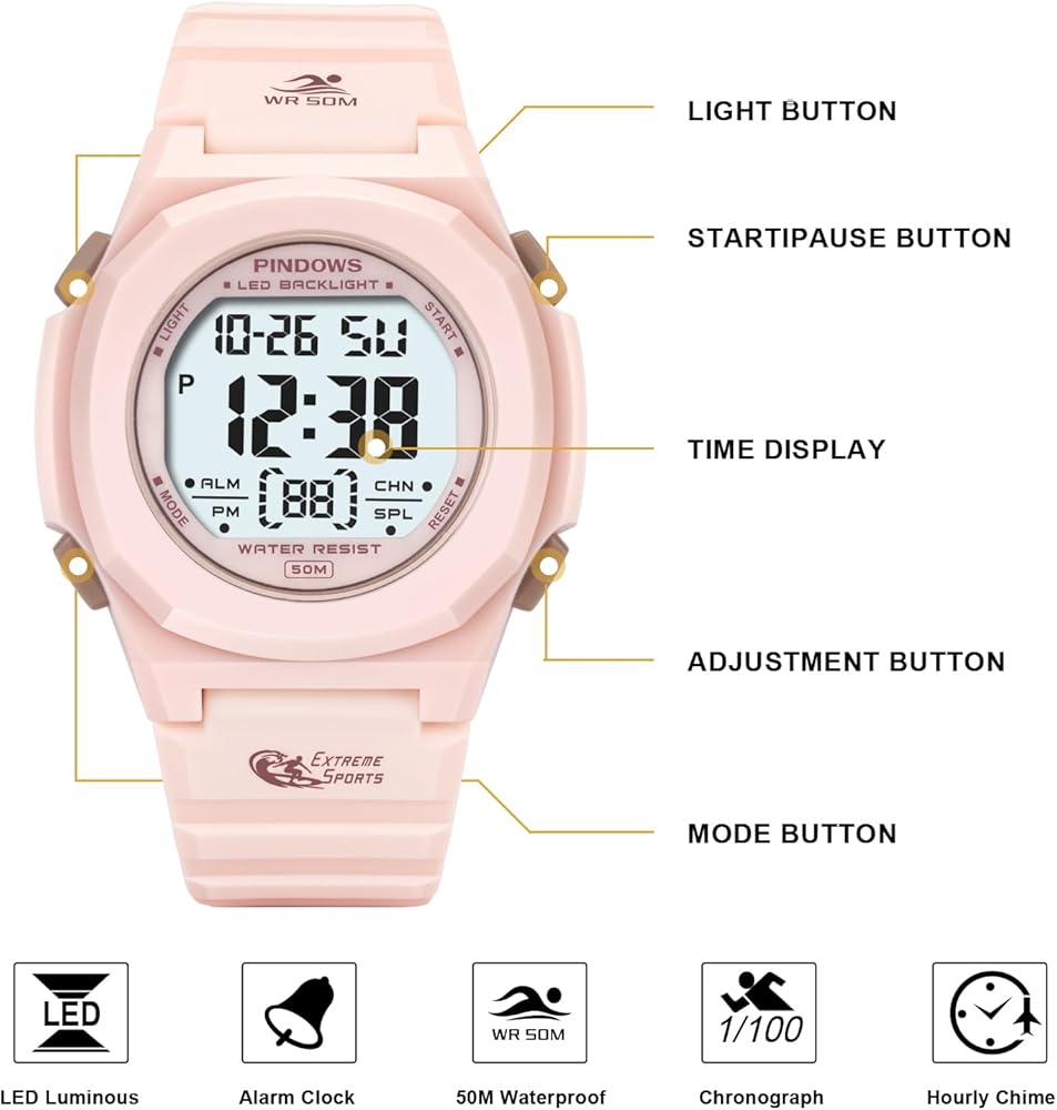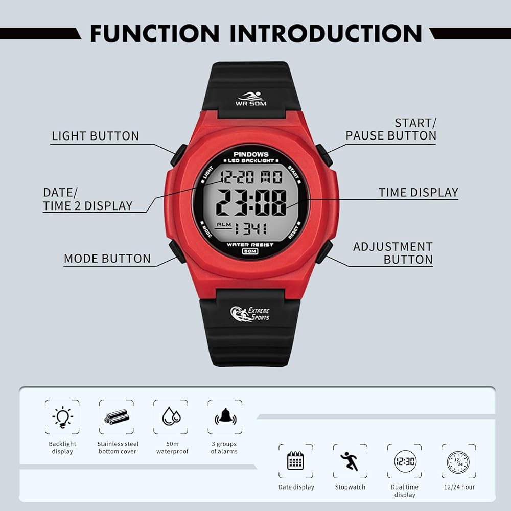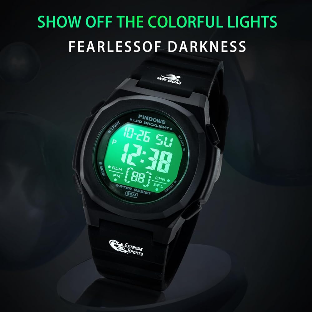 【متعدد الوظائف】مقاومة للماء بدقة تصل إلى 50 مترًا، إضاءة خلفية LED، منبه، نظام 12/24 ساعة، تقويم تلقائي، منبه كل ساعة، وتوقيت ساعة التوقف يجعلها مثالية للأنشطة المختلفة.