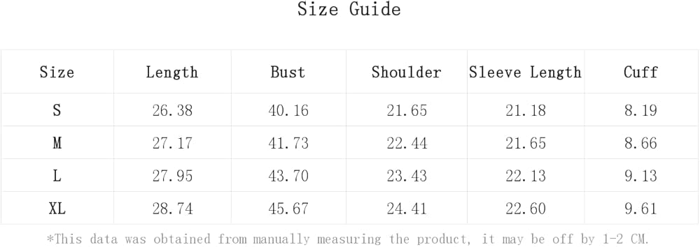 Medium: US: 38.0", Bust: 41.7", Cuff: 8.7", Length: 27.2", Shoulder: 22.4", Sleeve Length: 21.7"