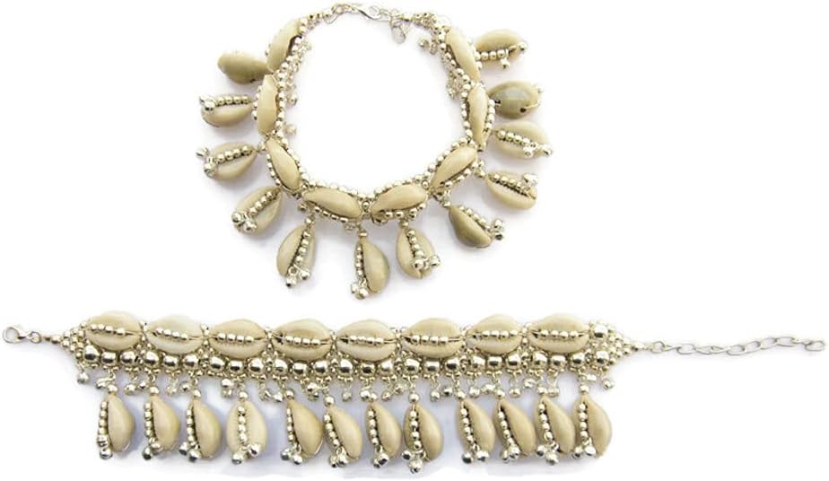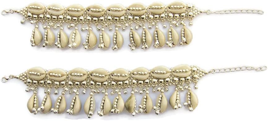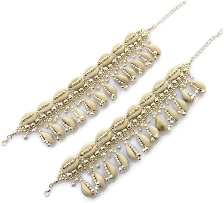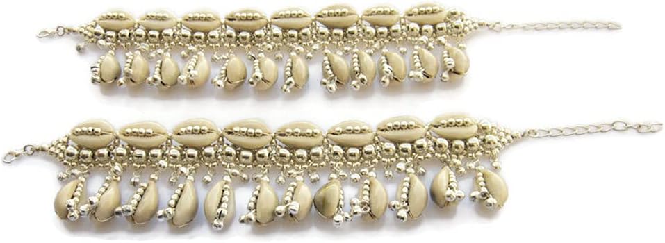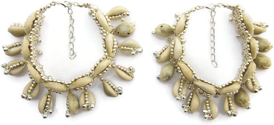 Natural Cowrie Shell Boho Anklets Pair for Women Hippie Rave Goth Festival Indian Anklet Payal Brass Beads Palted, Silver Beige, 9 inch + 2.5 inch extender adjustable if required