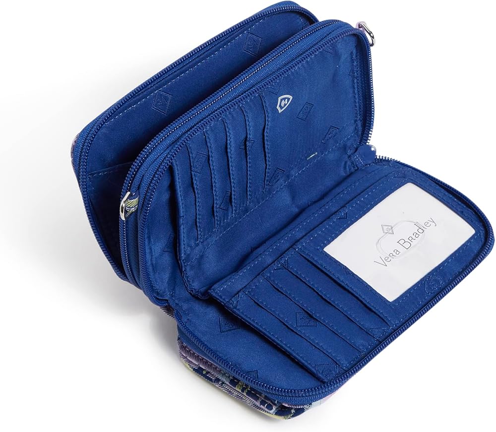 Our genuine Vera Bradley RFID All-in-One Crossbody is no exception to the rules of style, bringing you deluxe designs like only we can. Have you ever had 1 of those days when you aren't sure if you need a wallet, a wristlet, or a crossbody? The RFID All-in-One Crossbody can do all of that easily without sacrificing fashion. Featuring RFID protection for your credit cards and a front snap closure pocket sized perfectly to fit an iPhone 5 or the Samsung Galaxy. For storage, it contains 1 zippered compartment including 2 slip pockets and a zippered coin pocket. A second zippered compartment includes a large bill pocket, 10 card slips and an ID window for perfect organization every day. At Vera Bradley, we believe in quality and style which is why we build our beautiful bags to keep you in lasting luxury. Our Signature Cotton Collection focuses on fun and functional 100% cotton fabric with clever and practical details for durability and fade-resistance. The quilted stitching sewn in tight configurations make up the Vera Bradley Signature Diamond Stitch, which not only adds an element of embroidered appeal and aesthetic, but also enhances the structural integrity of your favorite bag. Our bags are made for long lasting convenience and style, machine washable and fade-resistant this item can be a go-to staple for years to come. At our very core, Vera Bradley is an innovative brand for women. We've always been inspired by the needs of real women, and our proudest moments have been when we can bring communities of women together through their shared love of beauty. We design our products with a deep understanding of our consumer. You are the focus of all we do.