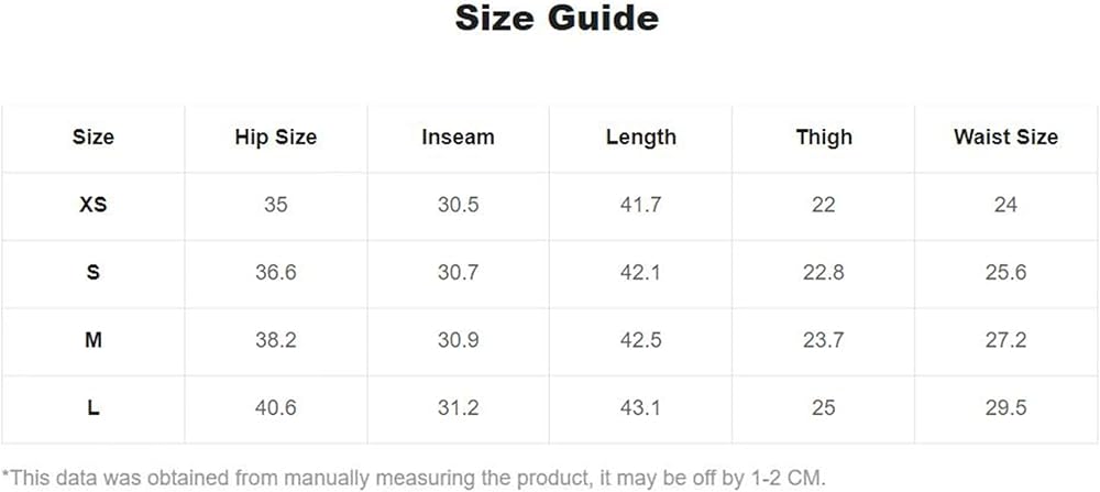 Small: Hip Size: 36.6", Inseam: 30.7", Length: 42.1", Thigh: 22.8", Waist Size: 25.6"